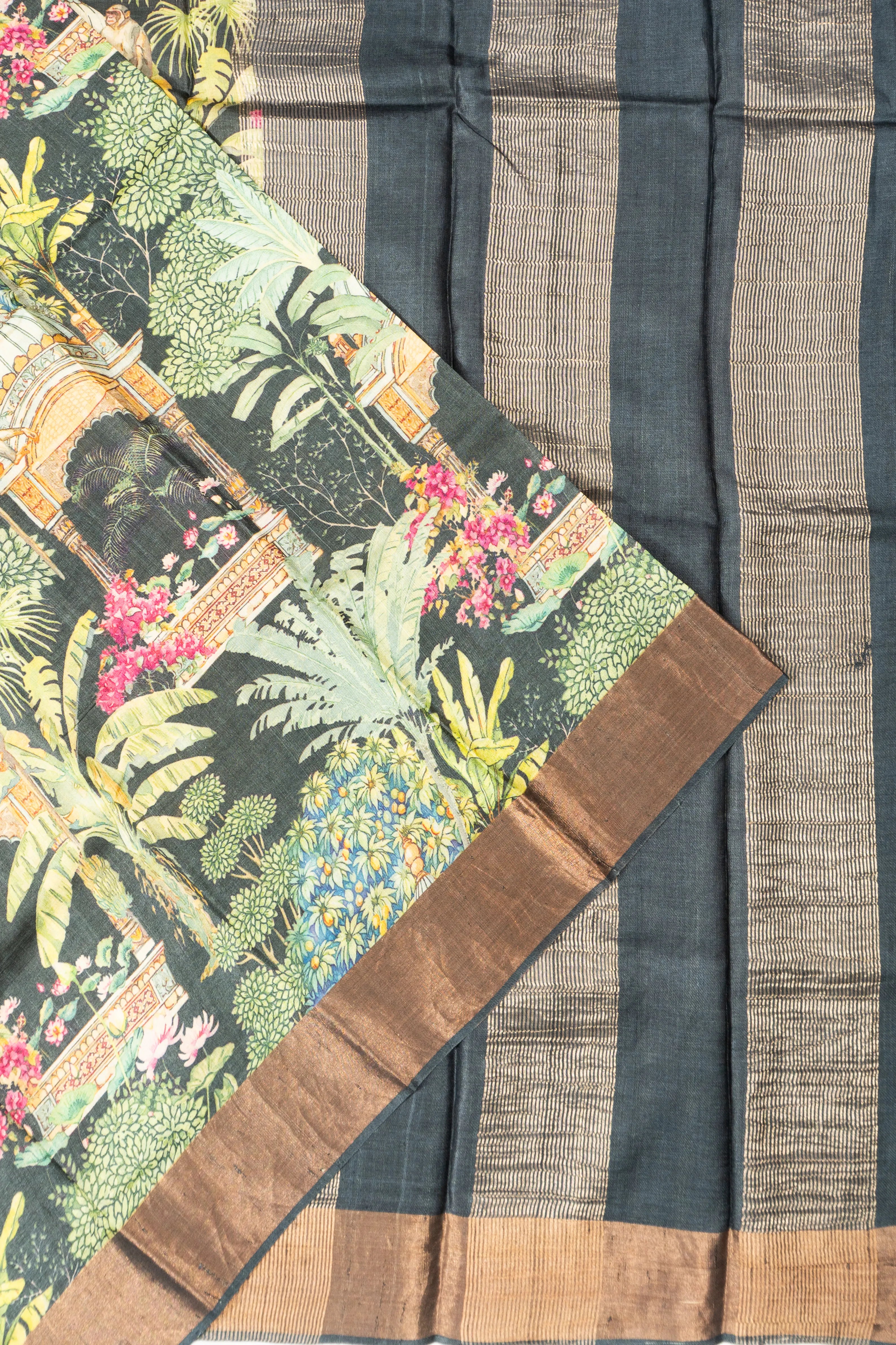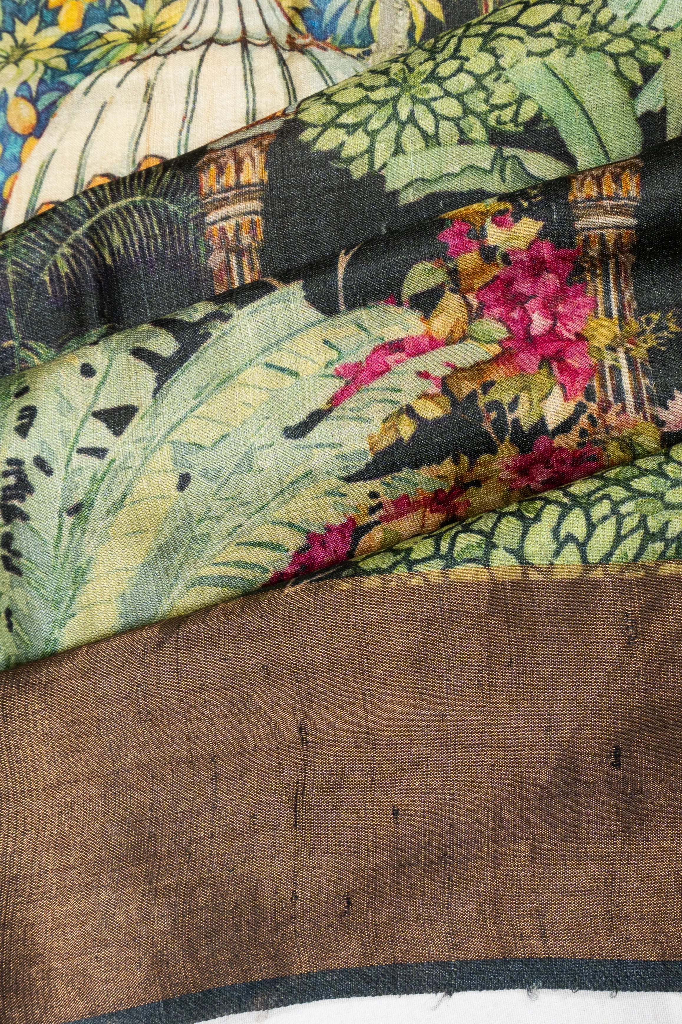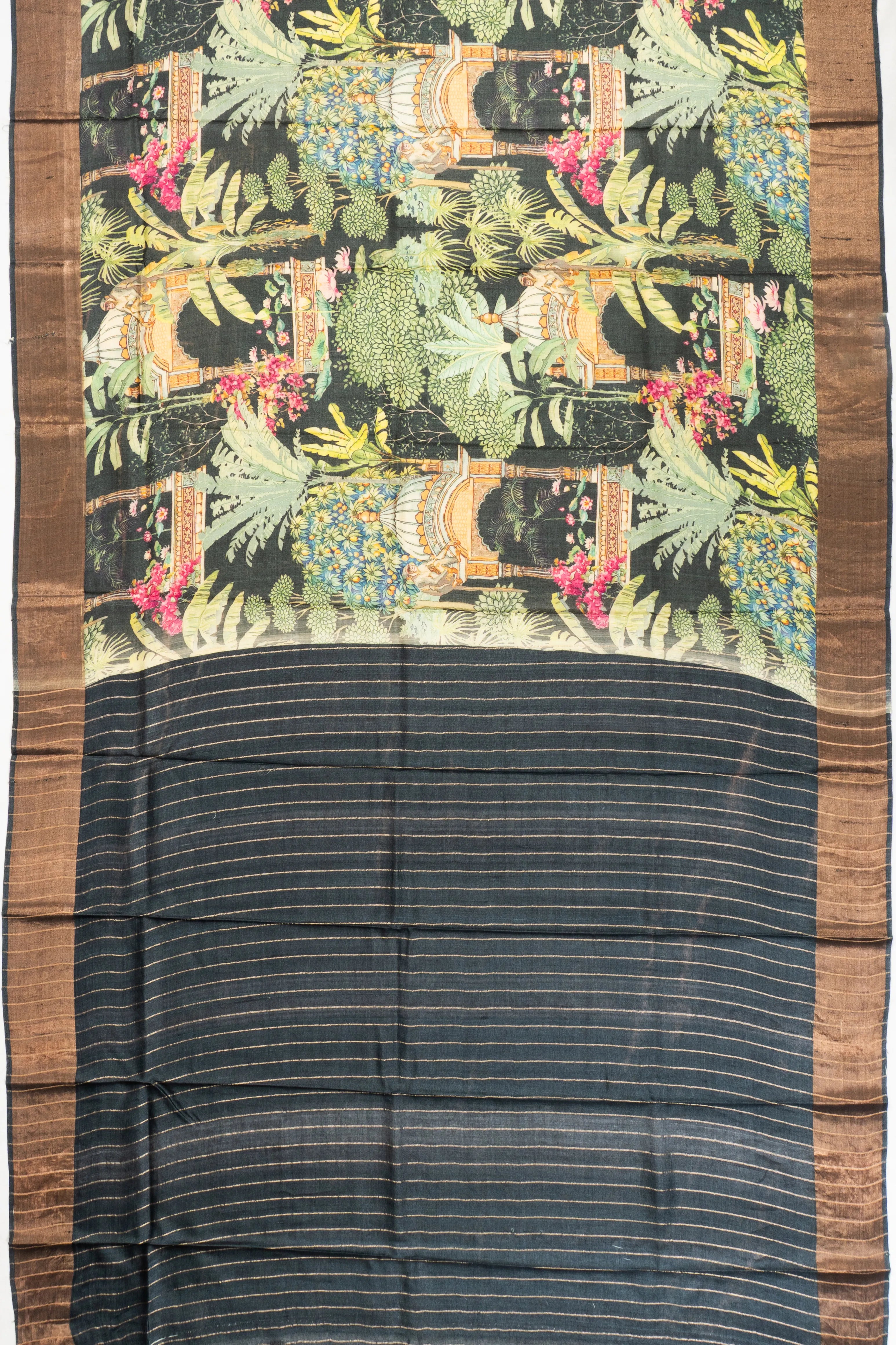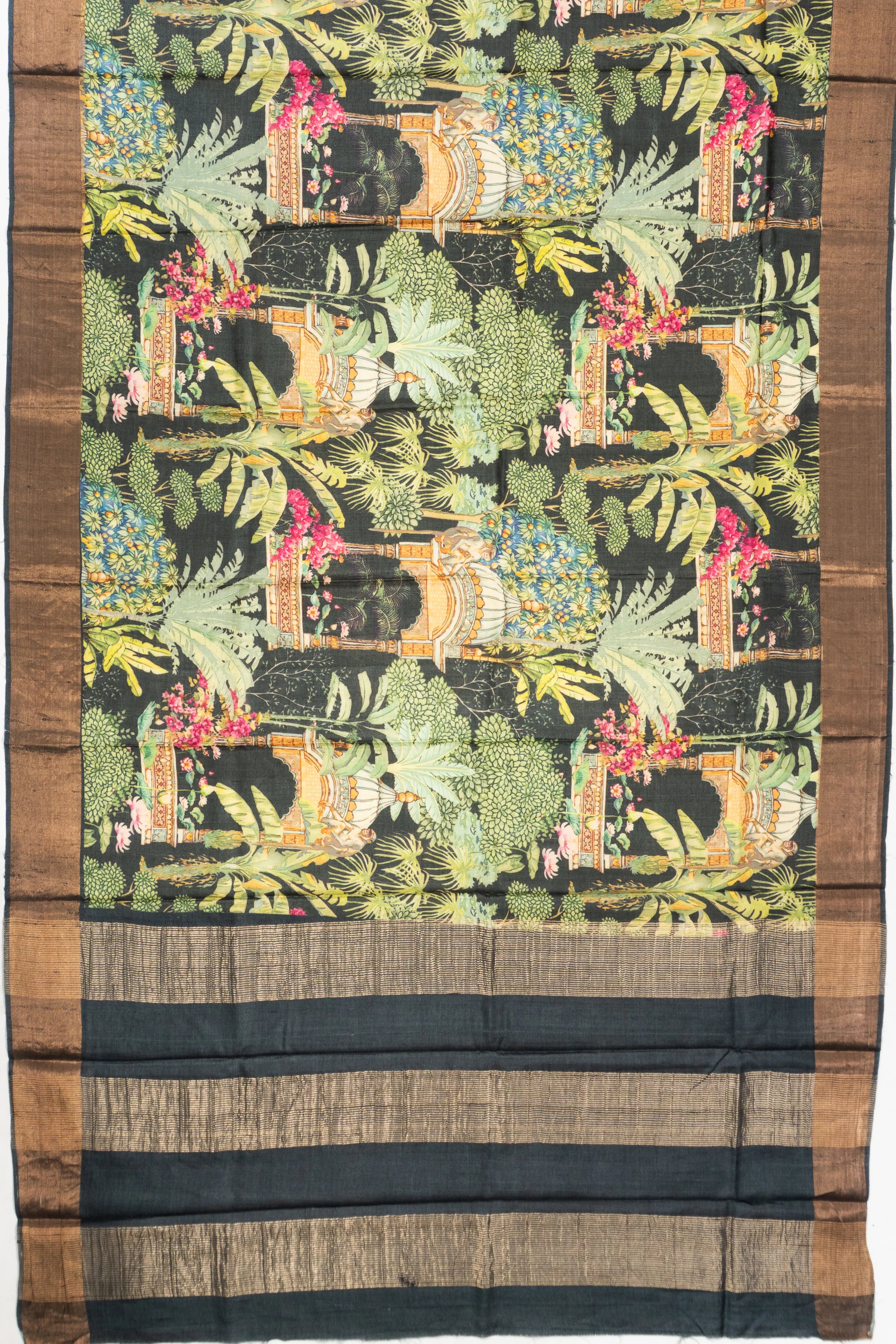 The saree features exquisite floral prints interspersed with charming monkey motifs, creating a tapestry of stories woven into the rich black silk