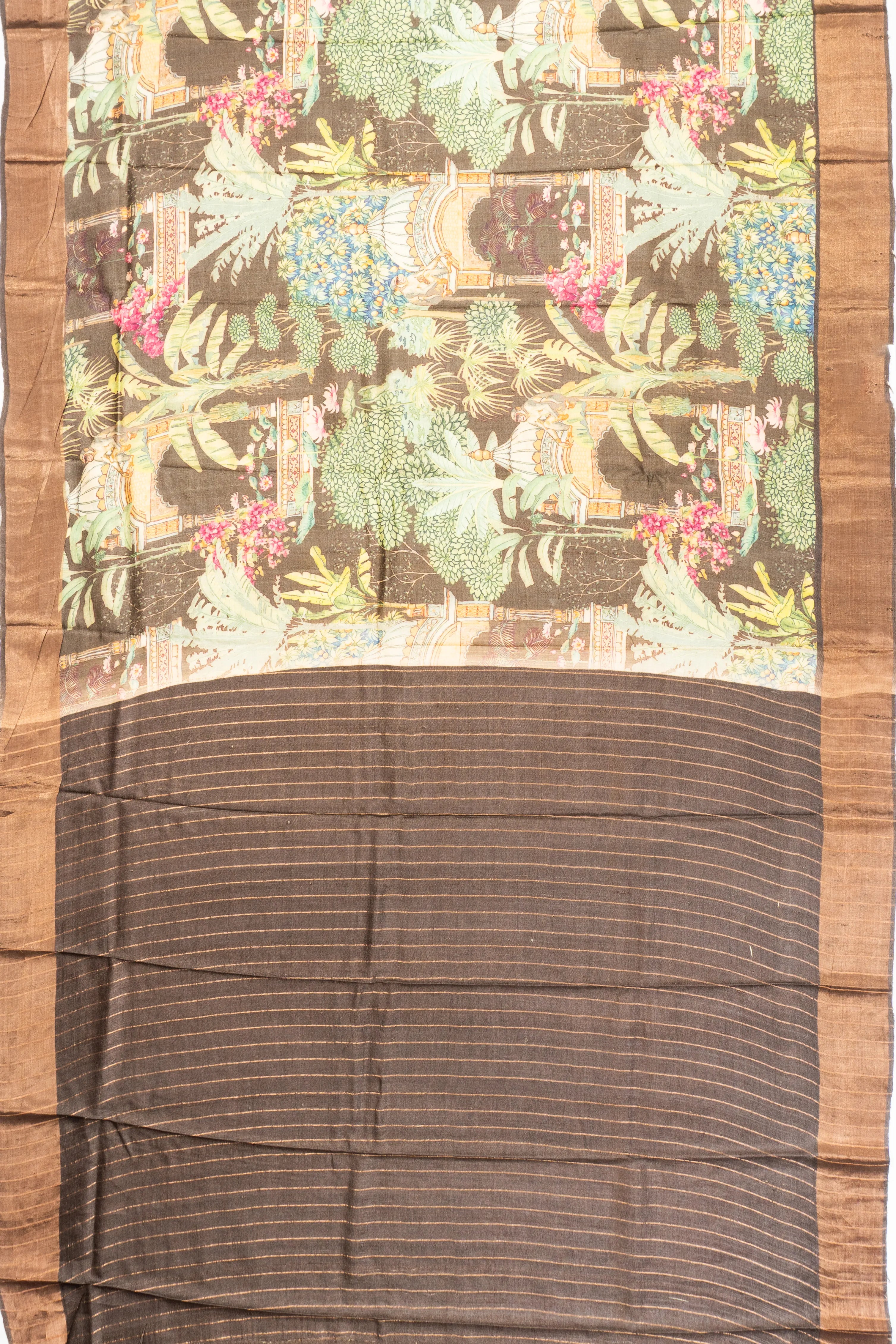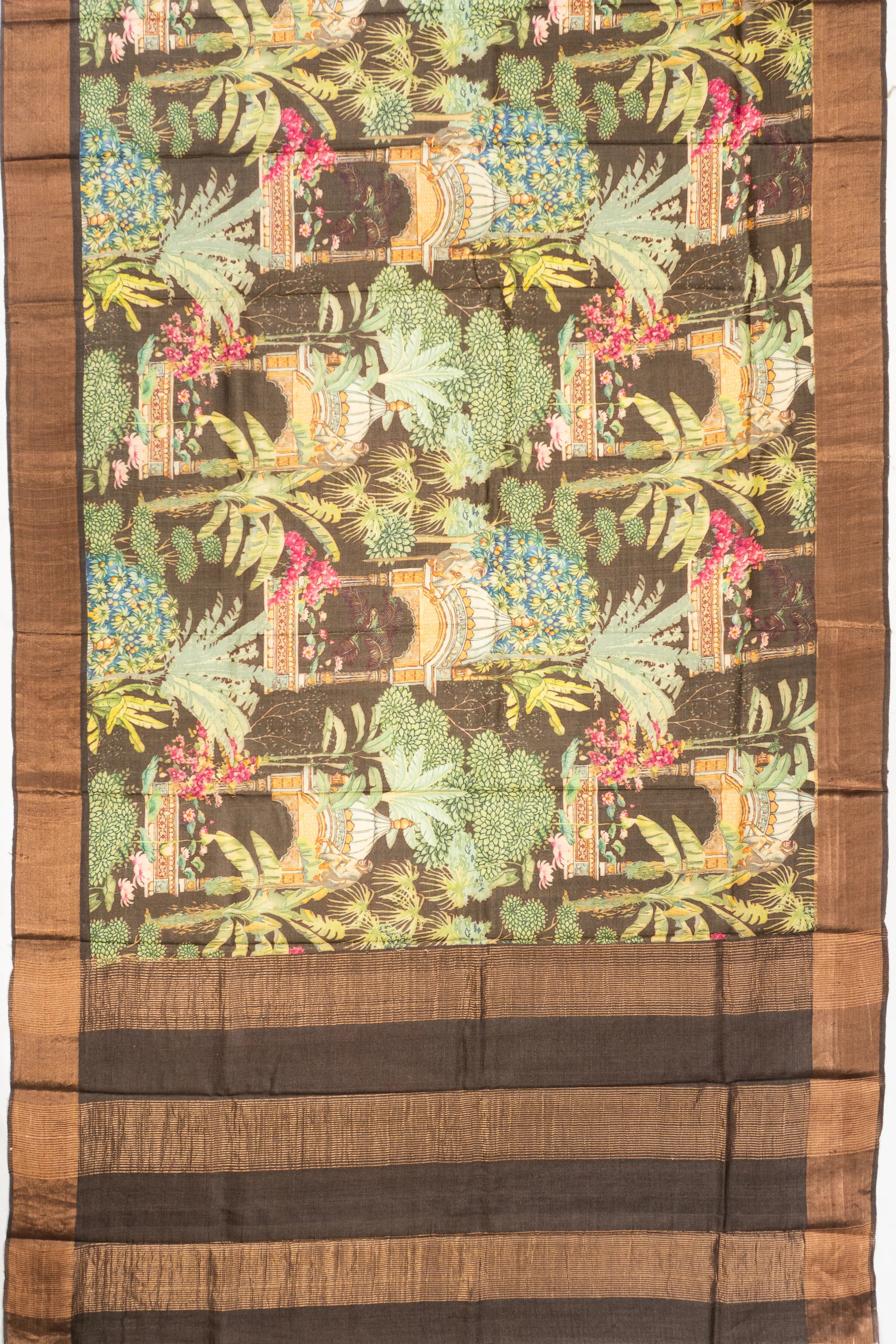 The saree's body is adorned with delicate floral prints interspersed with intriguing arches and playful monkey motifs, creating a visual symphony that captivates and delights