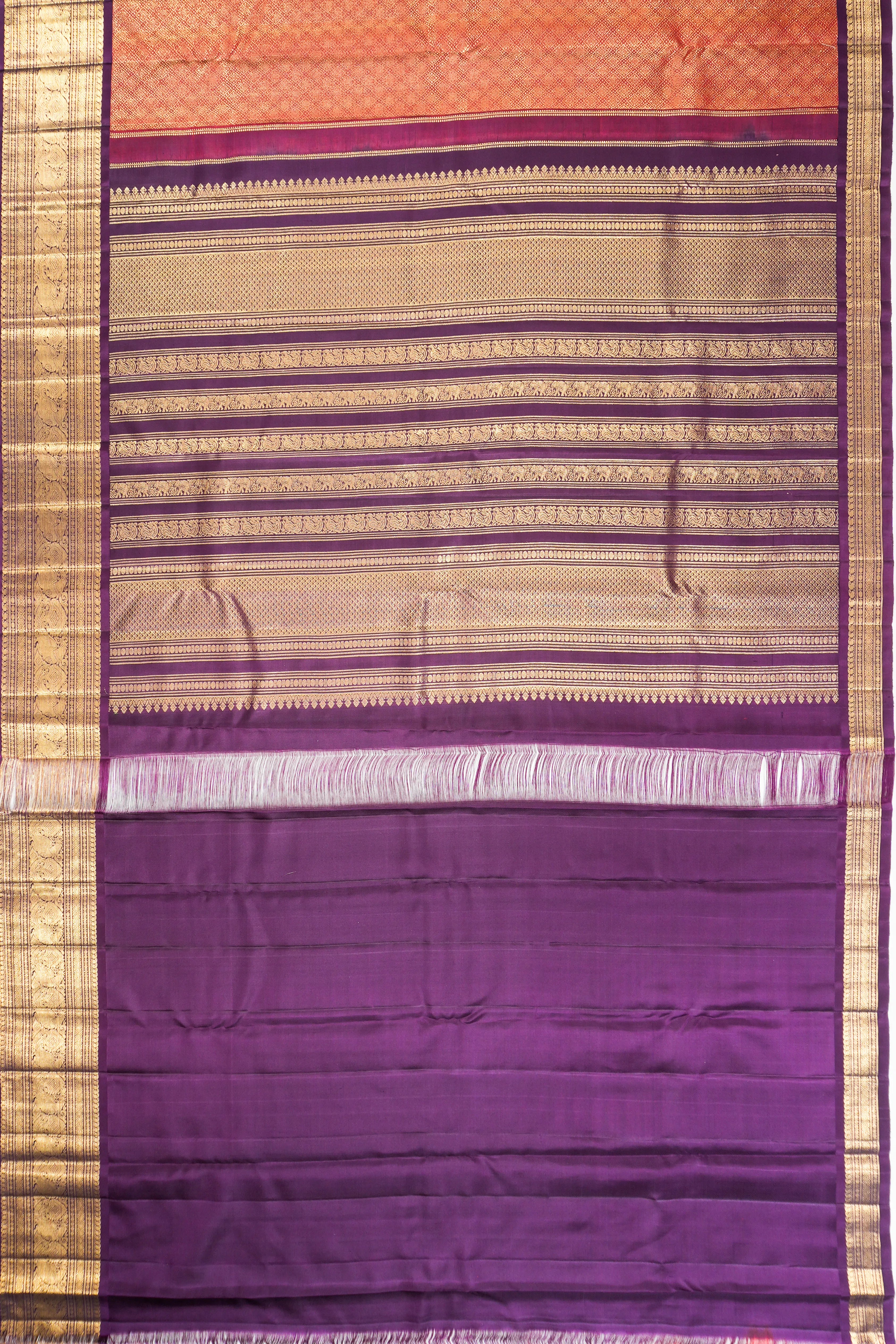 A striking contrast is offered by the medium purple border, embellished with gold zari detailing, enhancing the saree’s regal charm