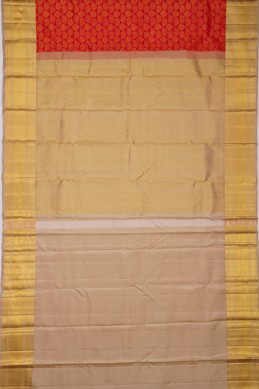 Embrace the allure of tradition with this Kanchipuram Silk Brocade Red Saree, a masterpiece of heritage-rich craftsmanship The saree's body is a striking red, exuding a sense of regal elegance that is both timeless and captivating