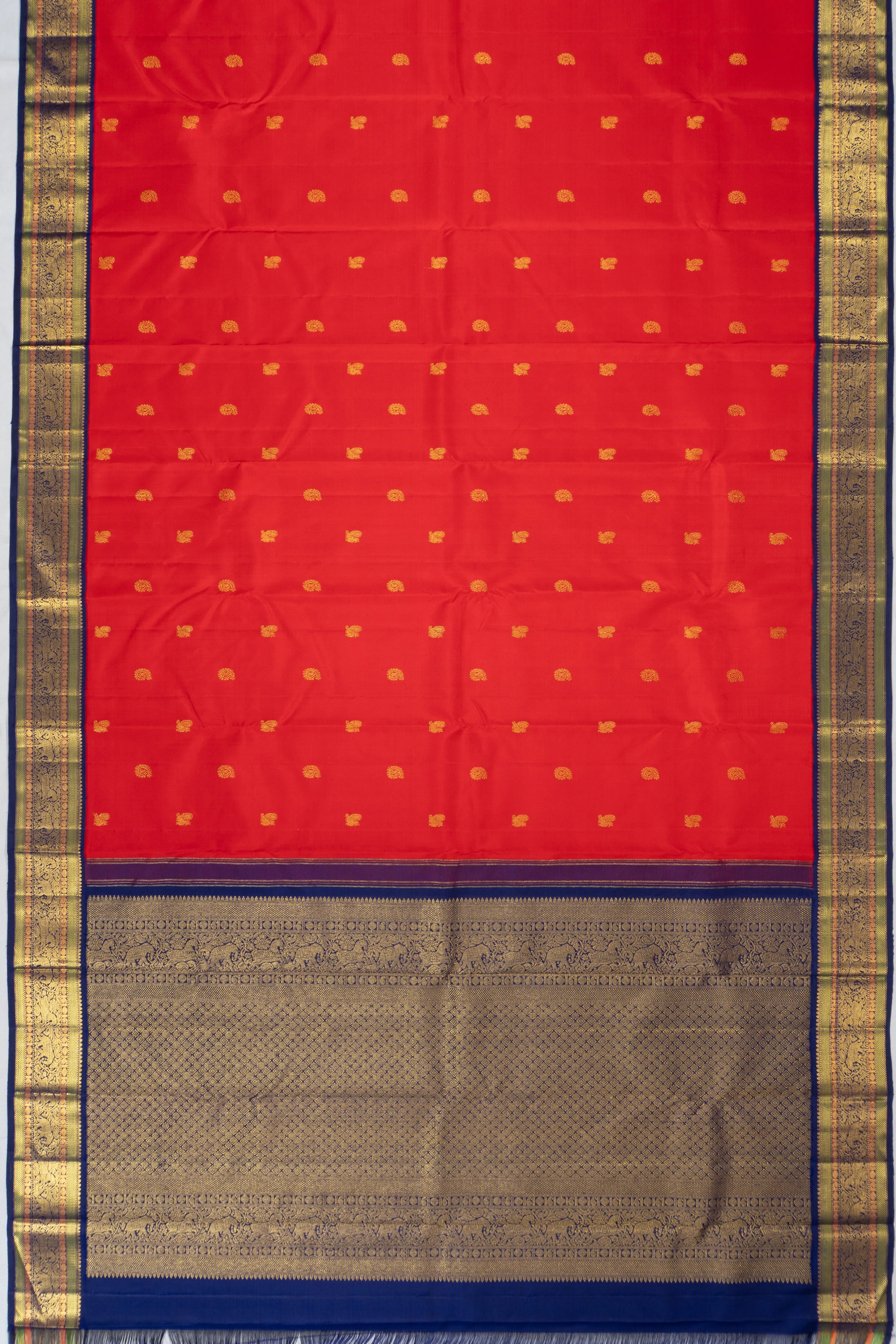 A harmonious dark blue border elevates the saree's grandeur, featuring intricate gold zari motifs of horses and elephants intertwined with floral vines