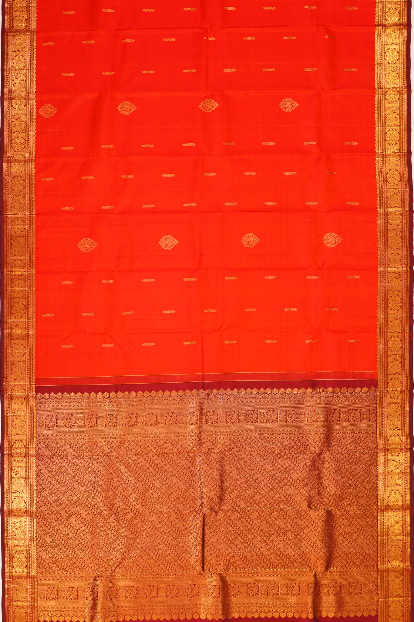 Embrace the allure of tradition with the Kanchipuram Silk Butta Red Saree, a masterpiece in heritage fashion The body is adorned with exquisite gold zari elephant motifs nestled in floral buttas, creating a regal tapestry that speaks of timeless elegance