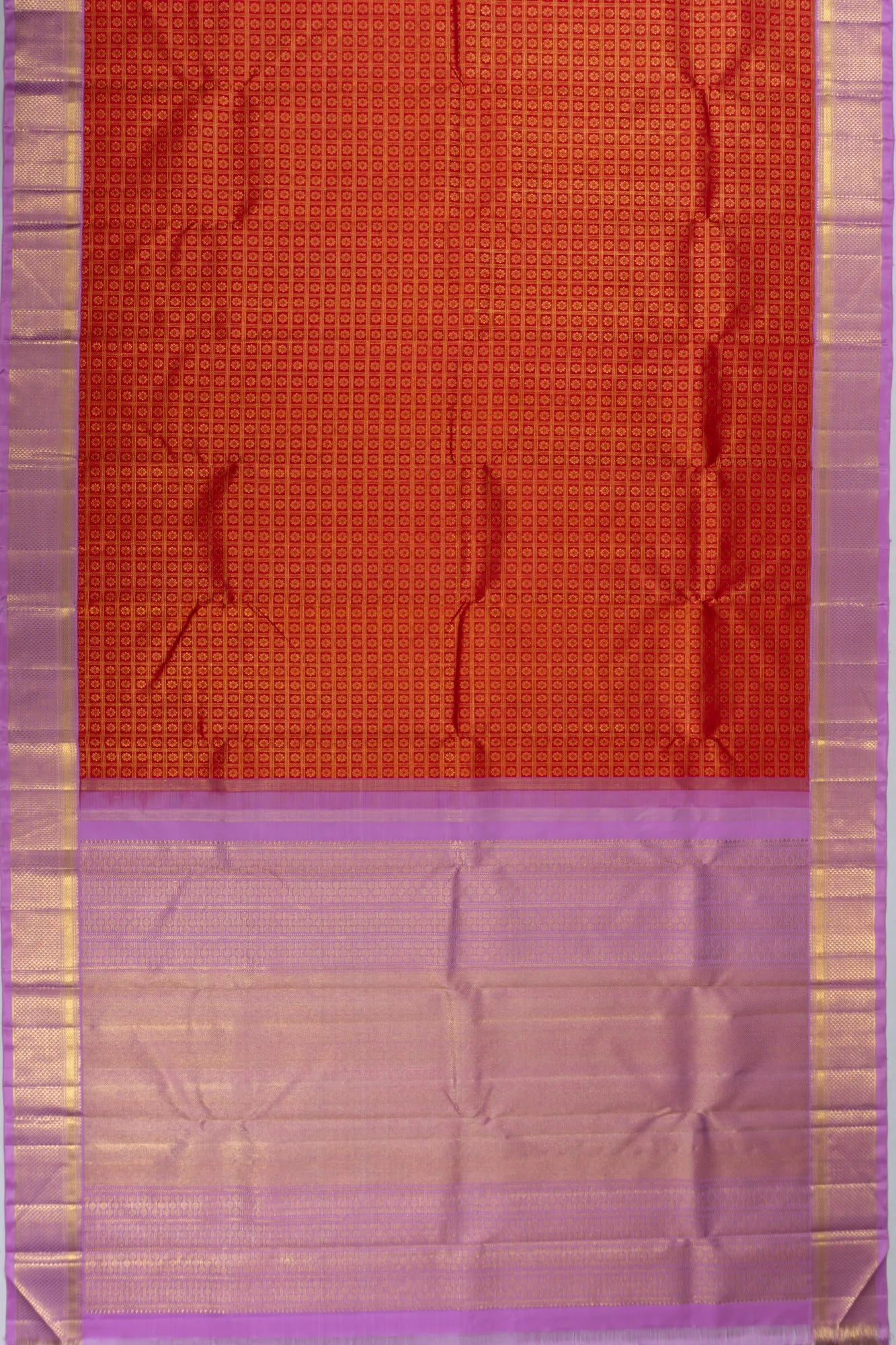 Embrace the allure of tradition with this exquisite Kanchipuram Silk Checks And Butta Red Saree, a masterpiece of heritage craftsmanship The saree's body features gold zari checks interspersed with delicate floral buttas, creating a sophisticated interplay of shimmer and pattern