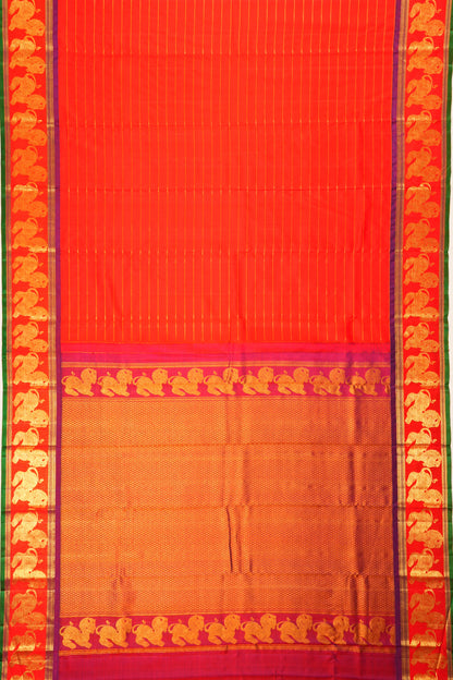 A bold red base enlivened with gold zari horizontal lines, striking a balance between vibrance and structure.