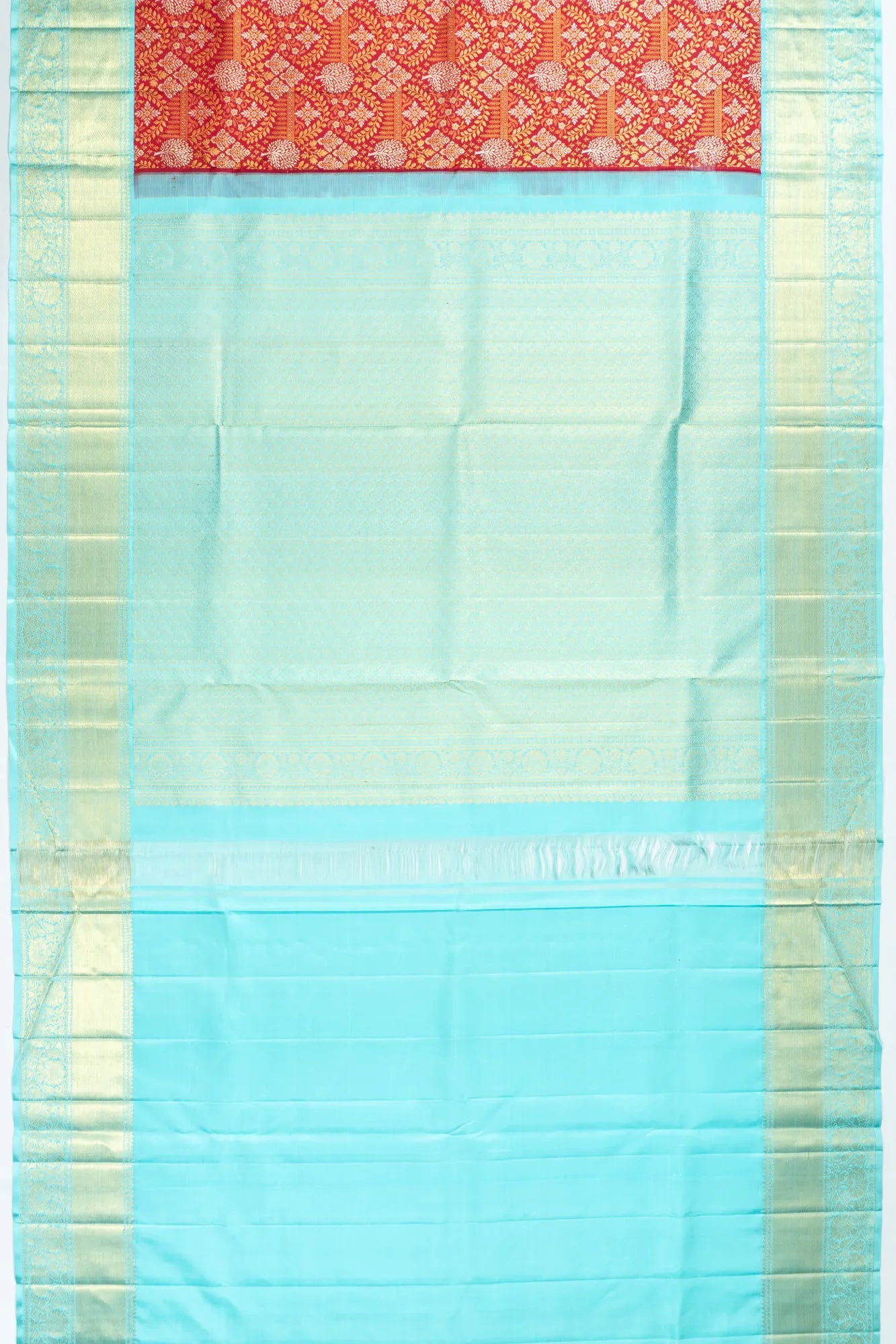 The vibrant red body is woven in gold and silver zari floral brocade, blending shine and depth for a rich, festive Kanchipuram silk statement.