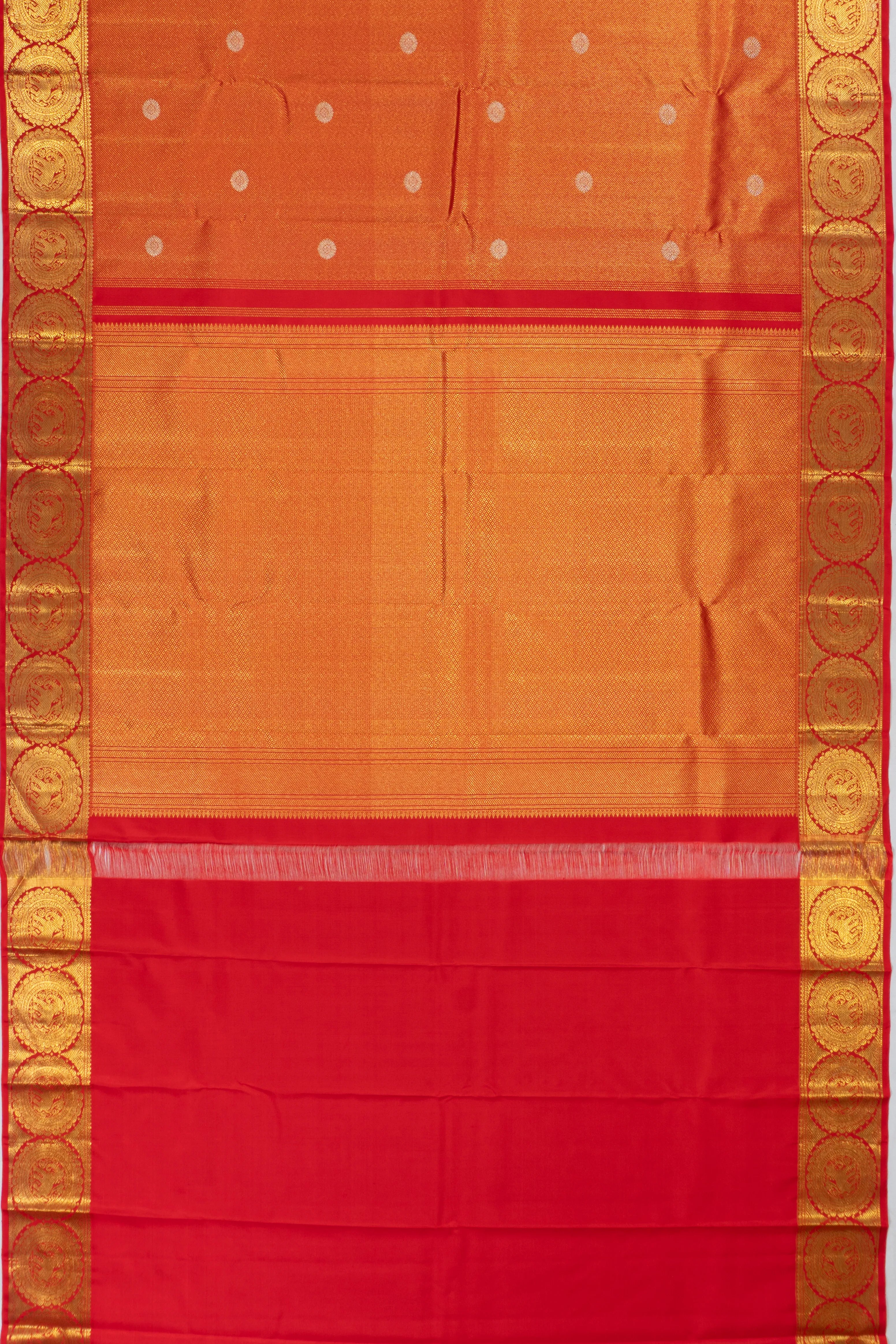 Step into a world of opulence with this Kanchipuram Silk Tissue and Butta Red Saree, a testament to the grandeur of heritage artistry The saree's body is adorned with gold zari tissue, enriched by the delicate silver zari floral buttas that add a touch of refined elegance to every fold