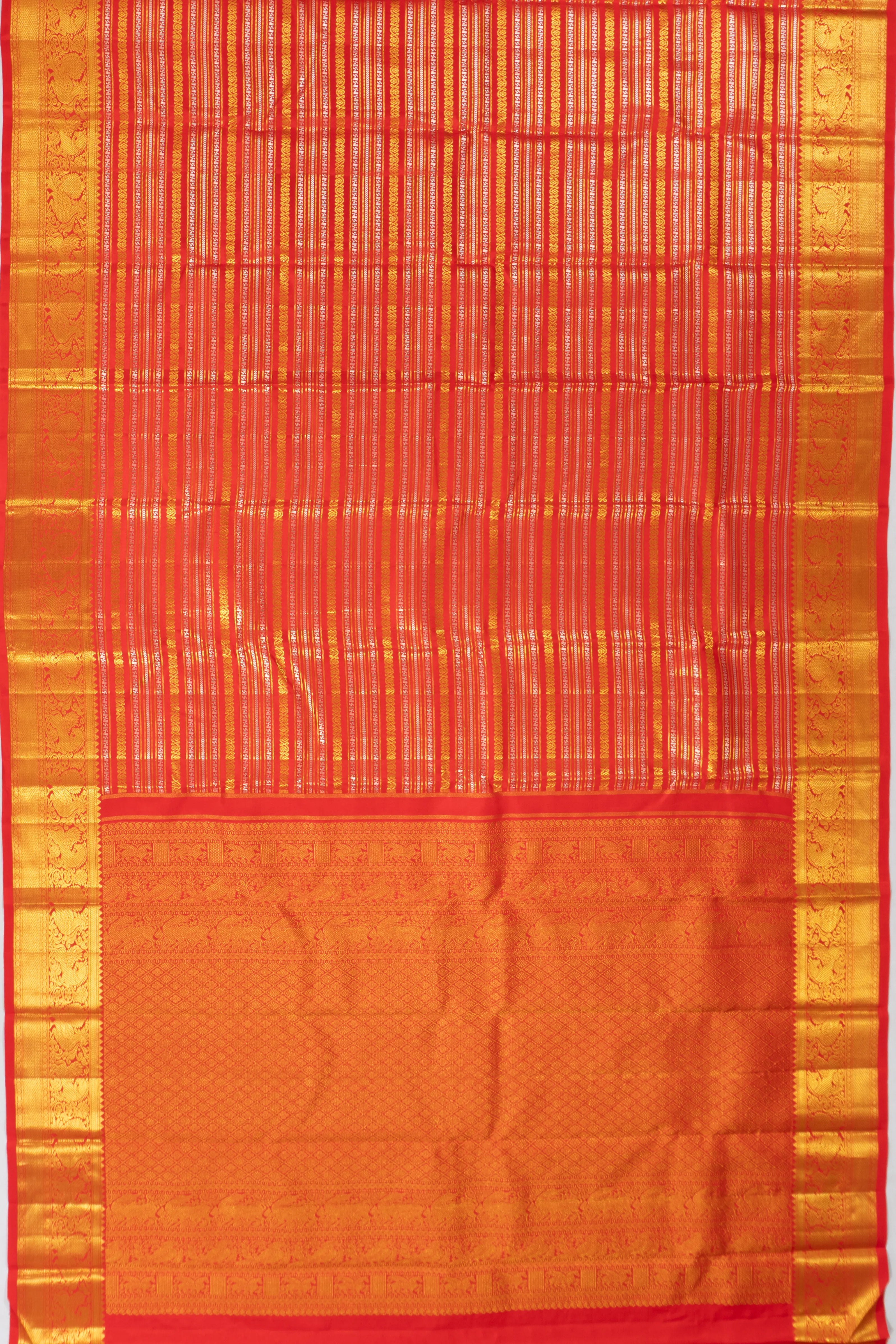 The saree's body is adorned with gold and silver zari floral brocade, creating a tapestry of elegance and allure that captures the eye