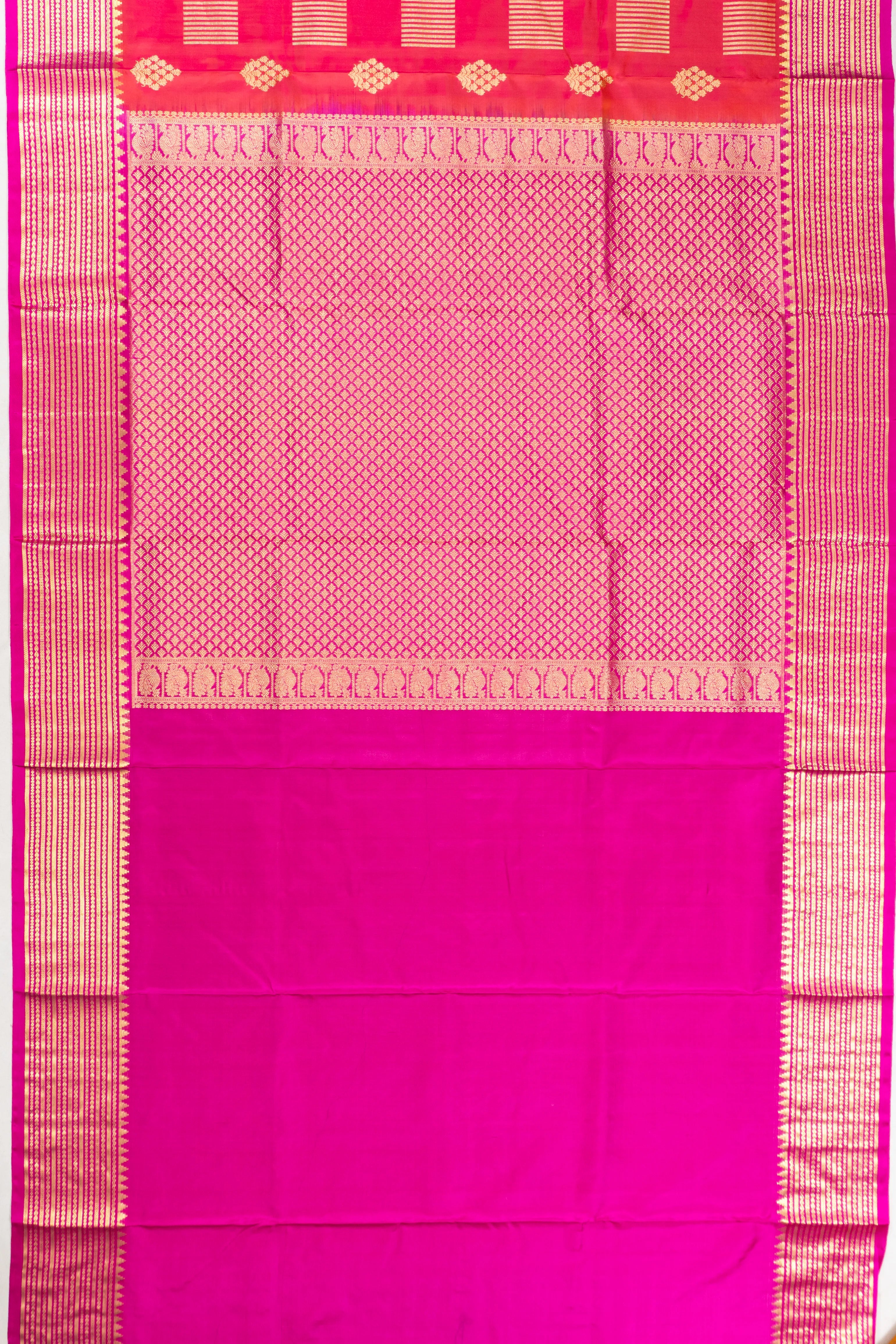 This exquisite saree showcases a luxurious gold zari floral brocade pattern across its body, creating an enchanting tapestry of elegance and heritage
