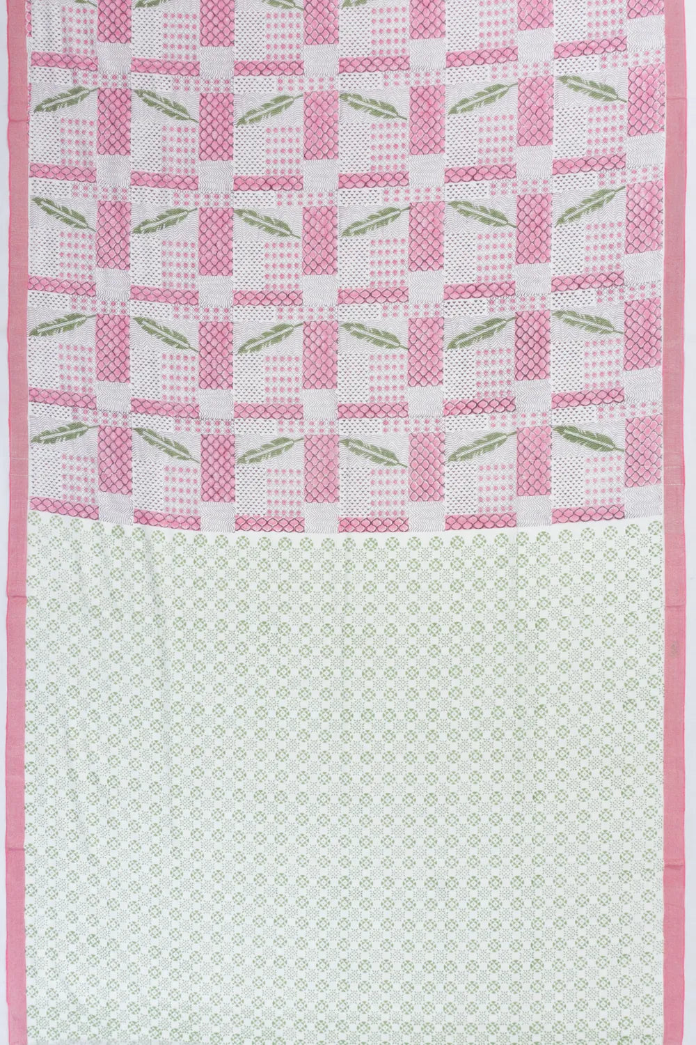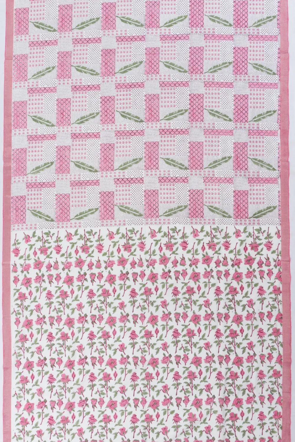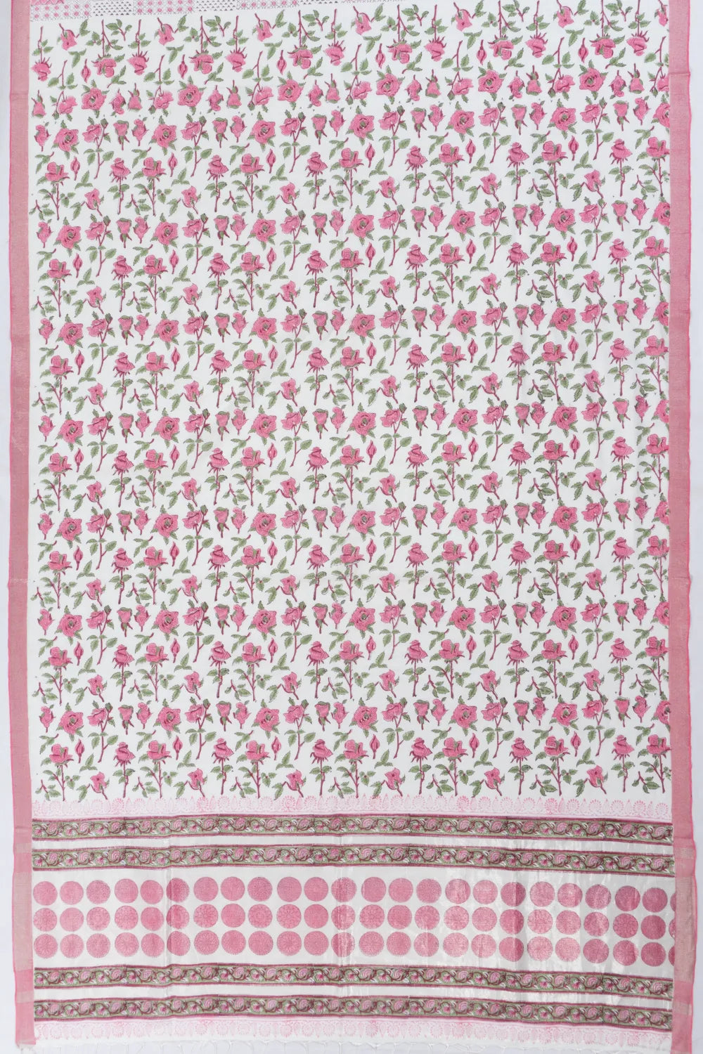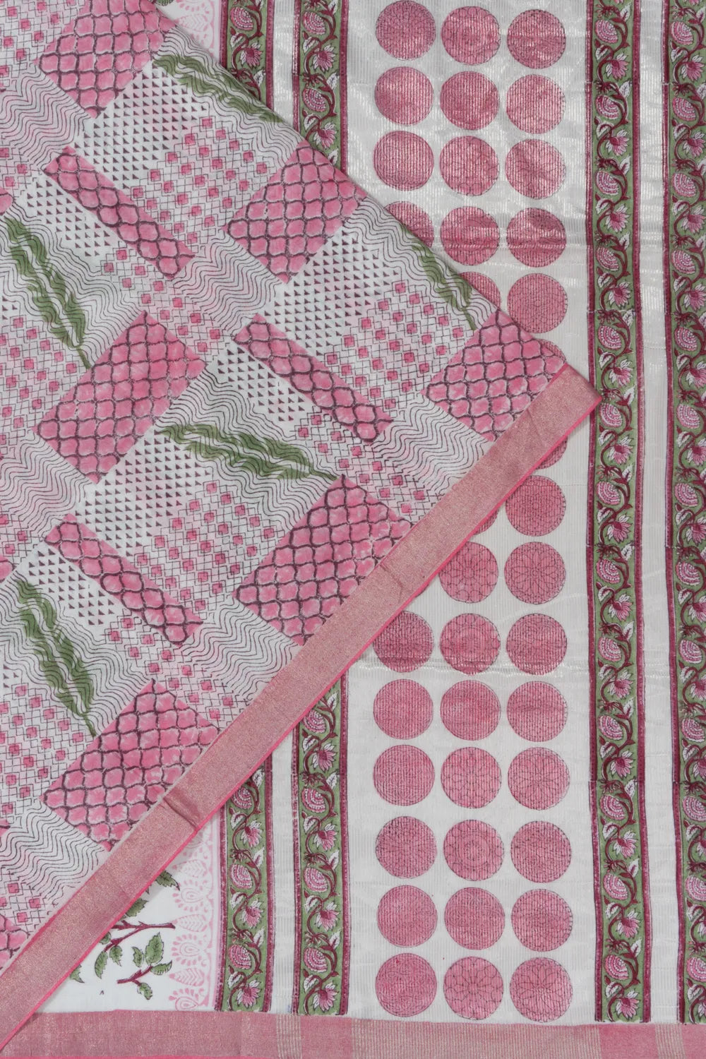 Elegant white Chanderi cotton saree featuring floral prints interspersed with geometrical brocade, offering a blend of tradition and subtle modernity.
