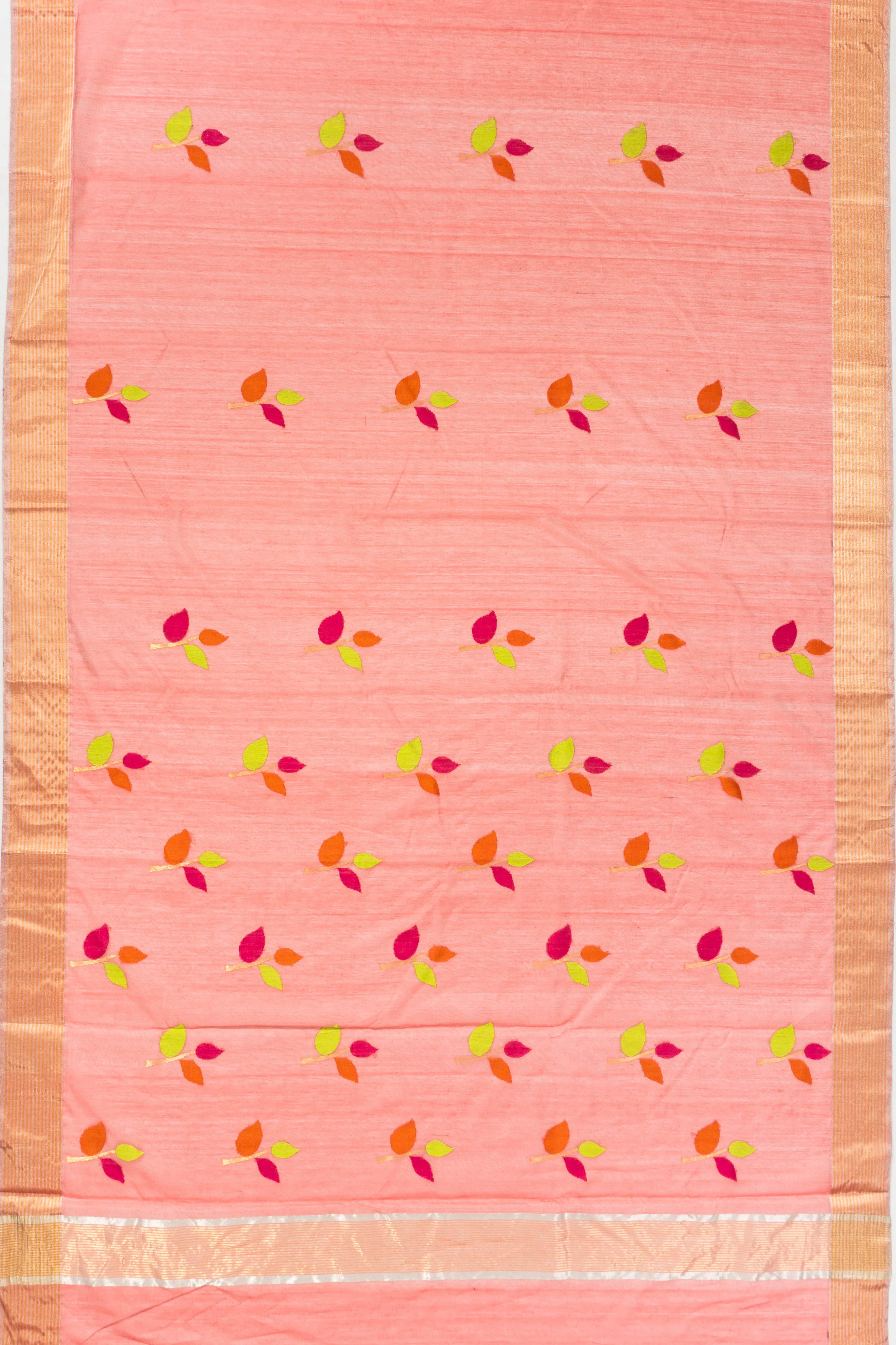 The saree's body is adorned with gold zari floral buttas, creating a delicate shimmer that exudes sophistication and grace