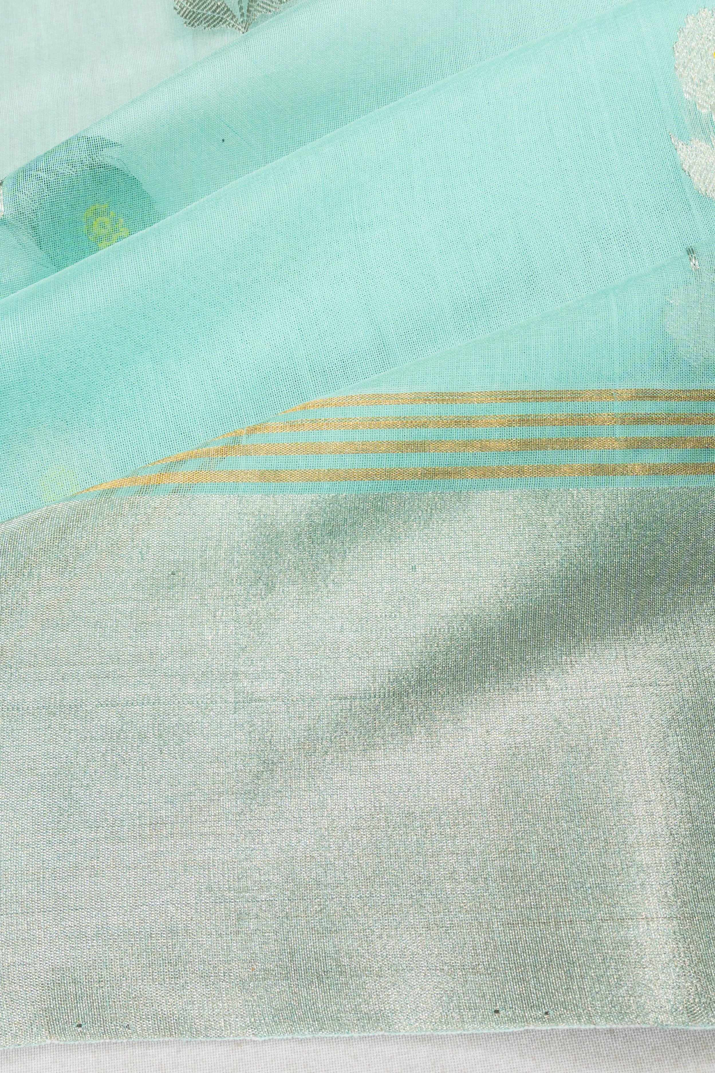 Accentuating its grace, the saree features a self silver zari small kaddi border, while the pallu showcases harmonious gold and silver zari vertical lines, adding a touch of opulence to its heritage-rich design