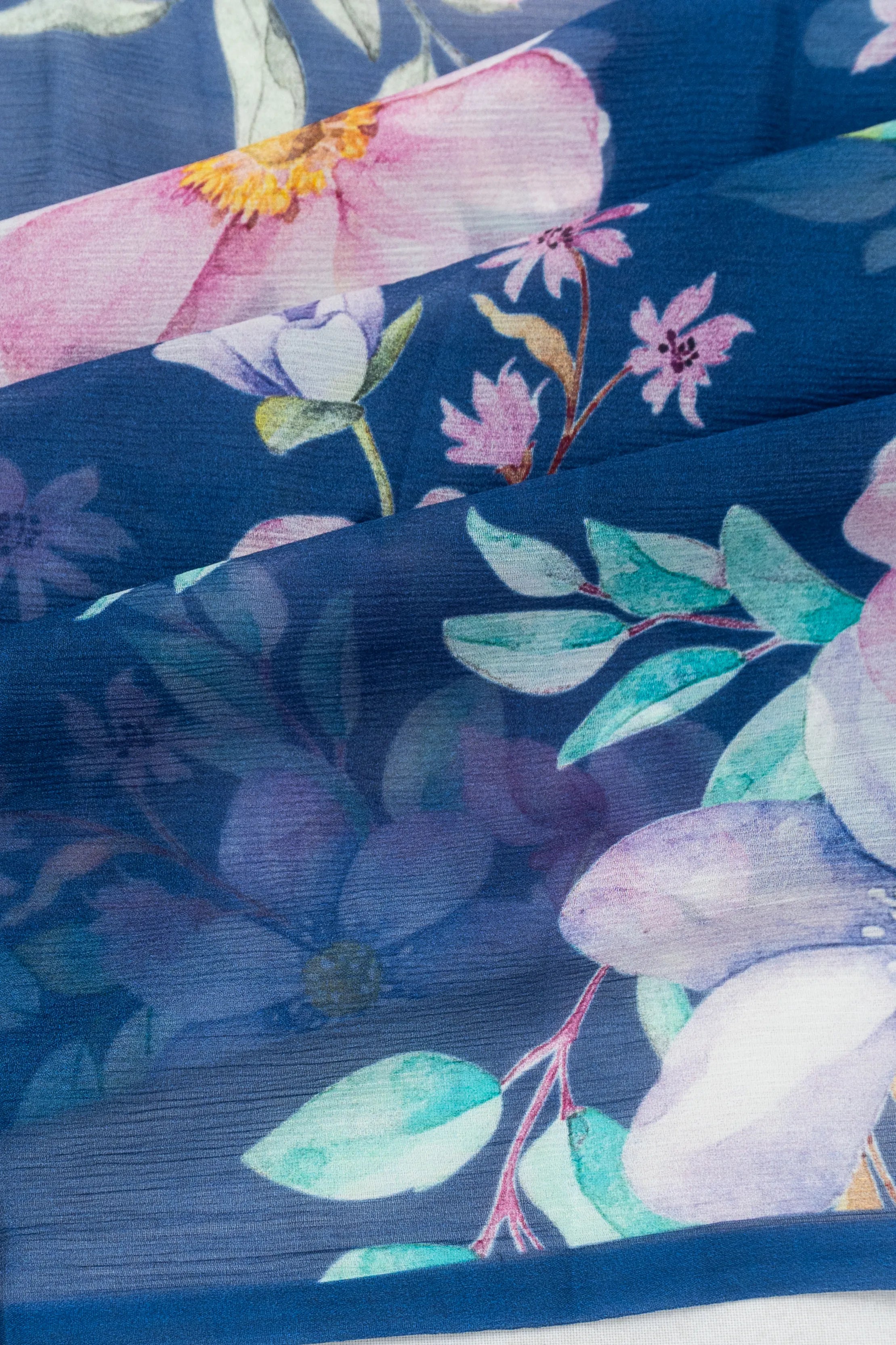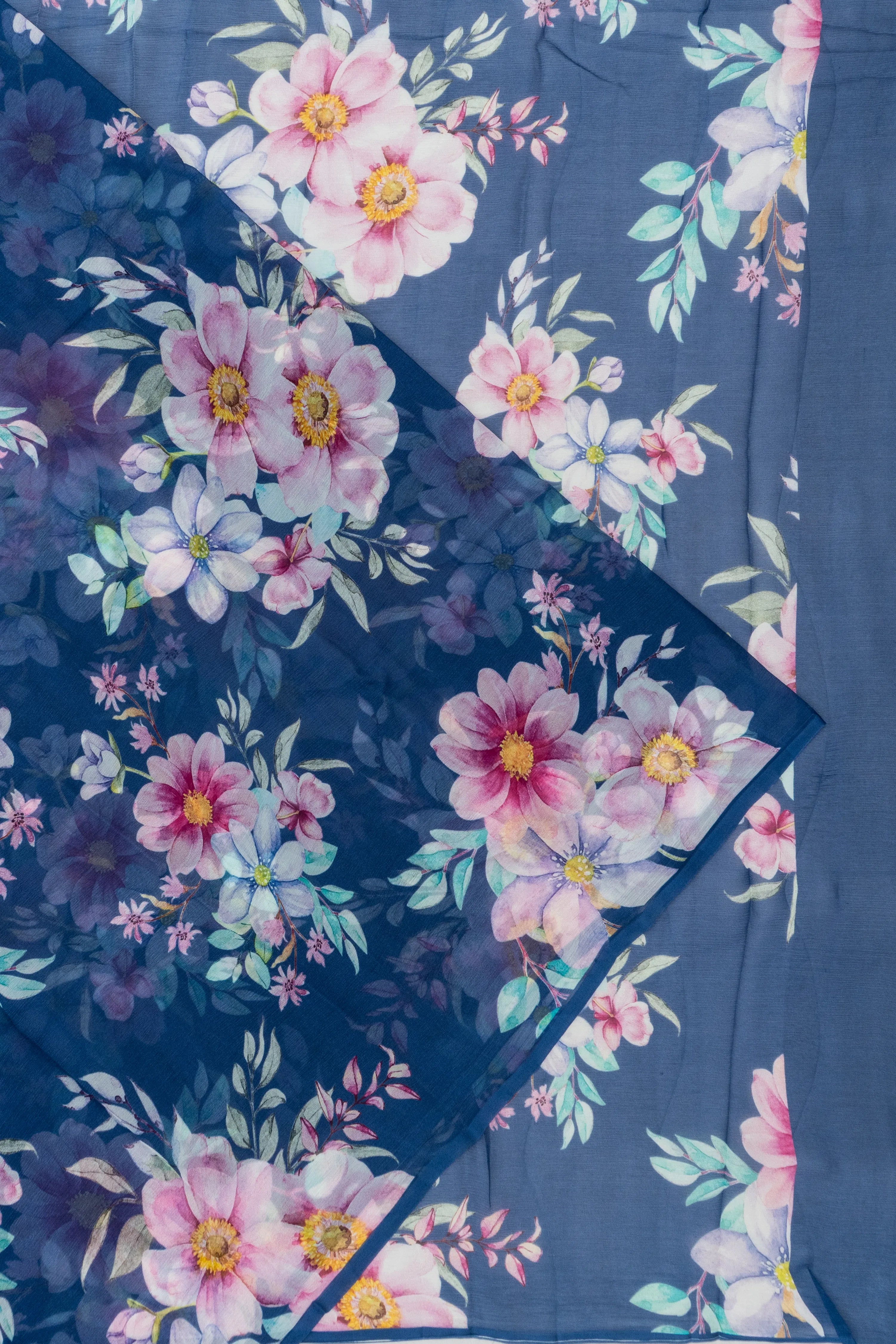 The saree's self floral printed pallu flows seamlessly, adding depth and continuity to the overall design
