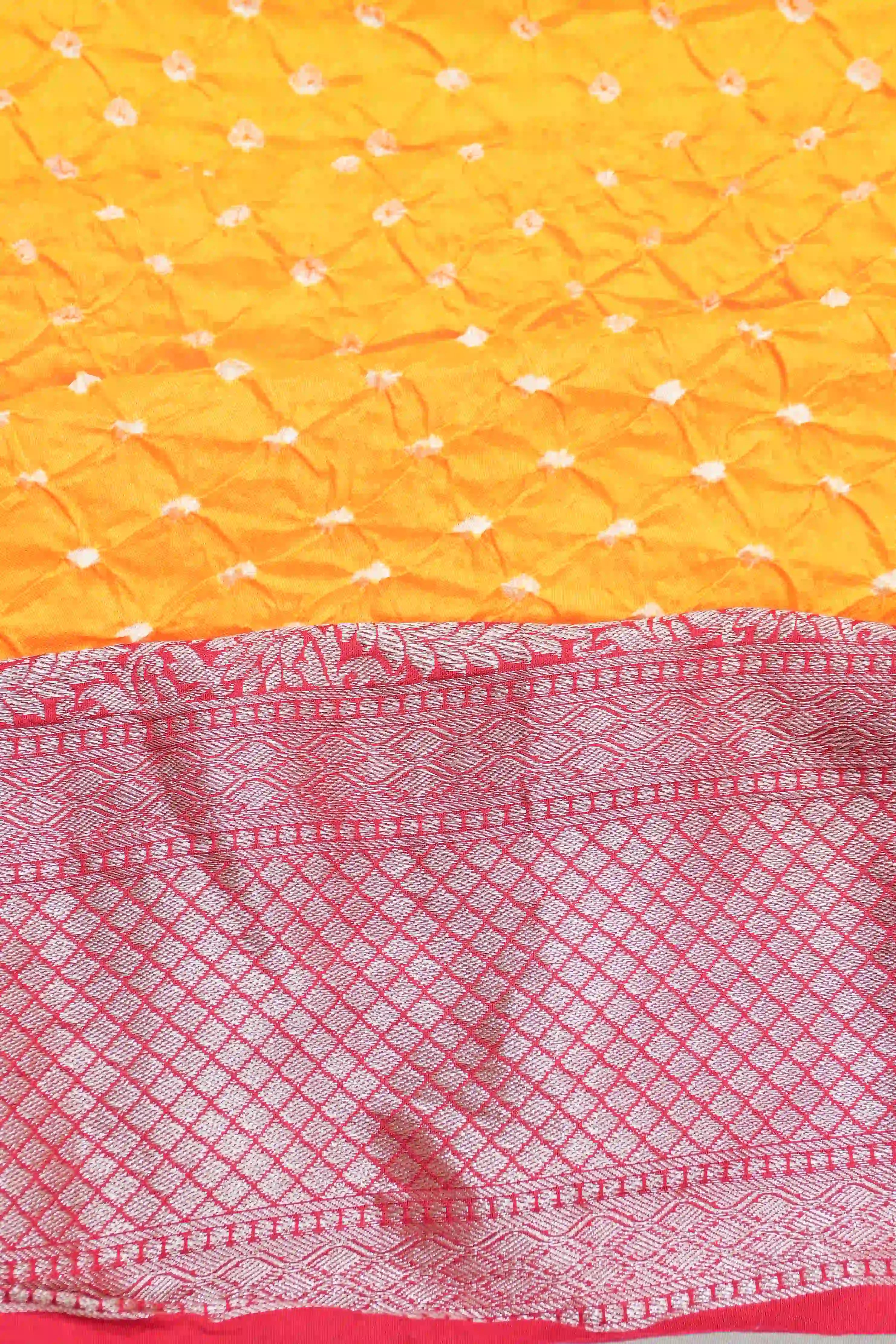 The vibrant yellow body is meticulously crafted with traditional bandhani patterns, showcasing an age-old art form that adds an exquisite texture and depth to the fabric