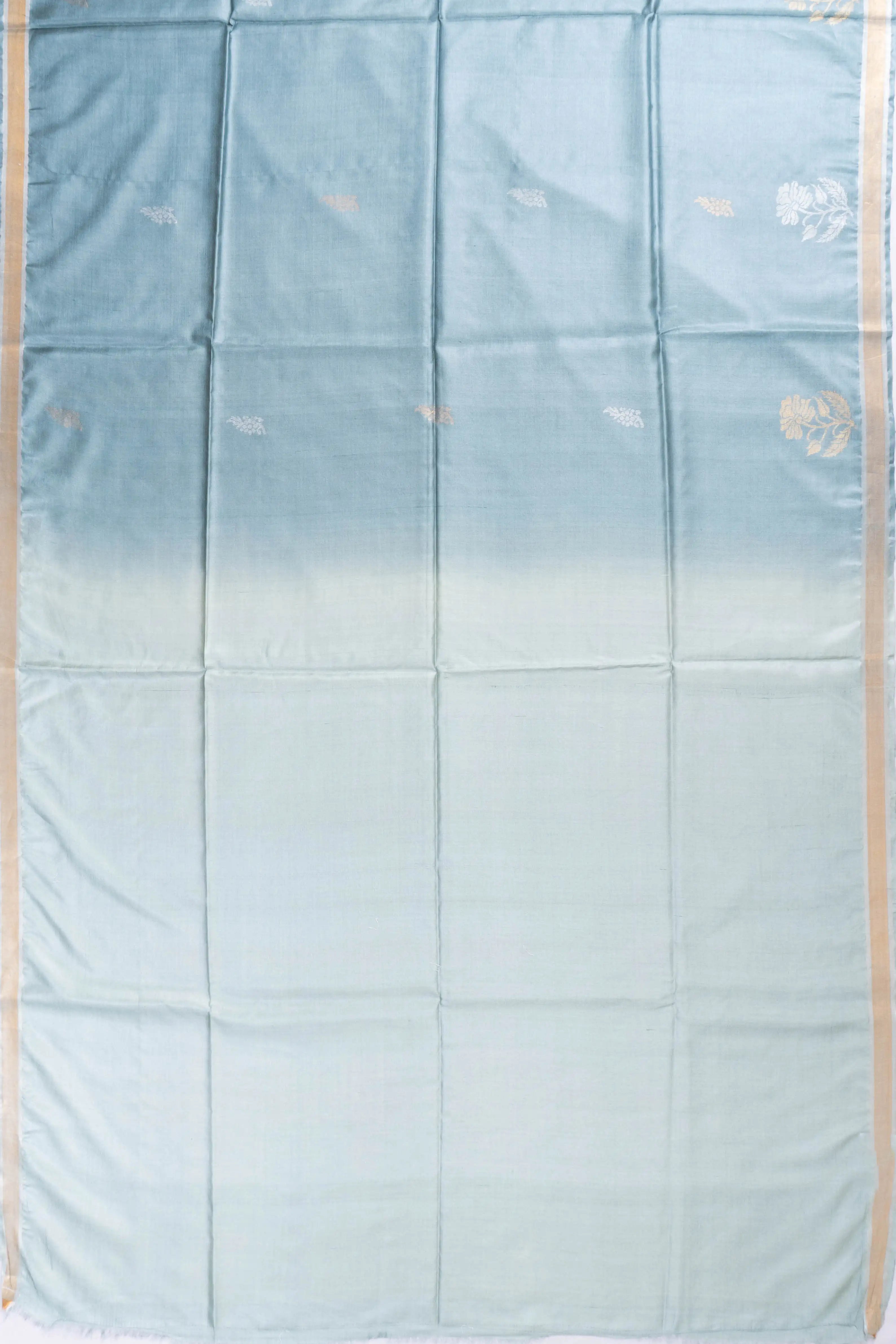 The self gold zari kaddi small border adds a touch of sophistication, while the contrast sea blue pallu features an exquisite gold zari floral brocade, complete with playful tassels for a hint of charm