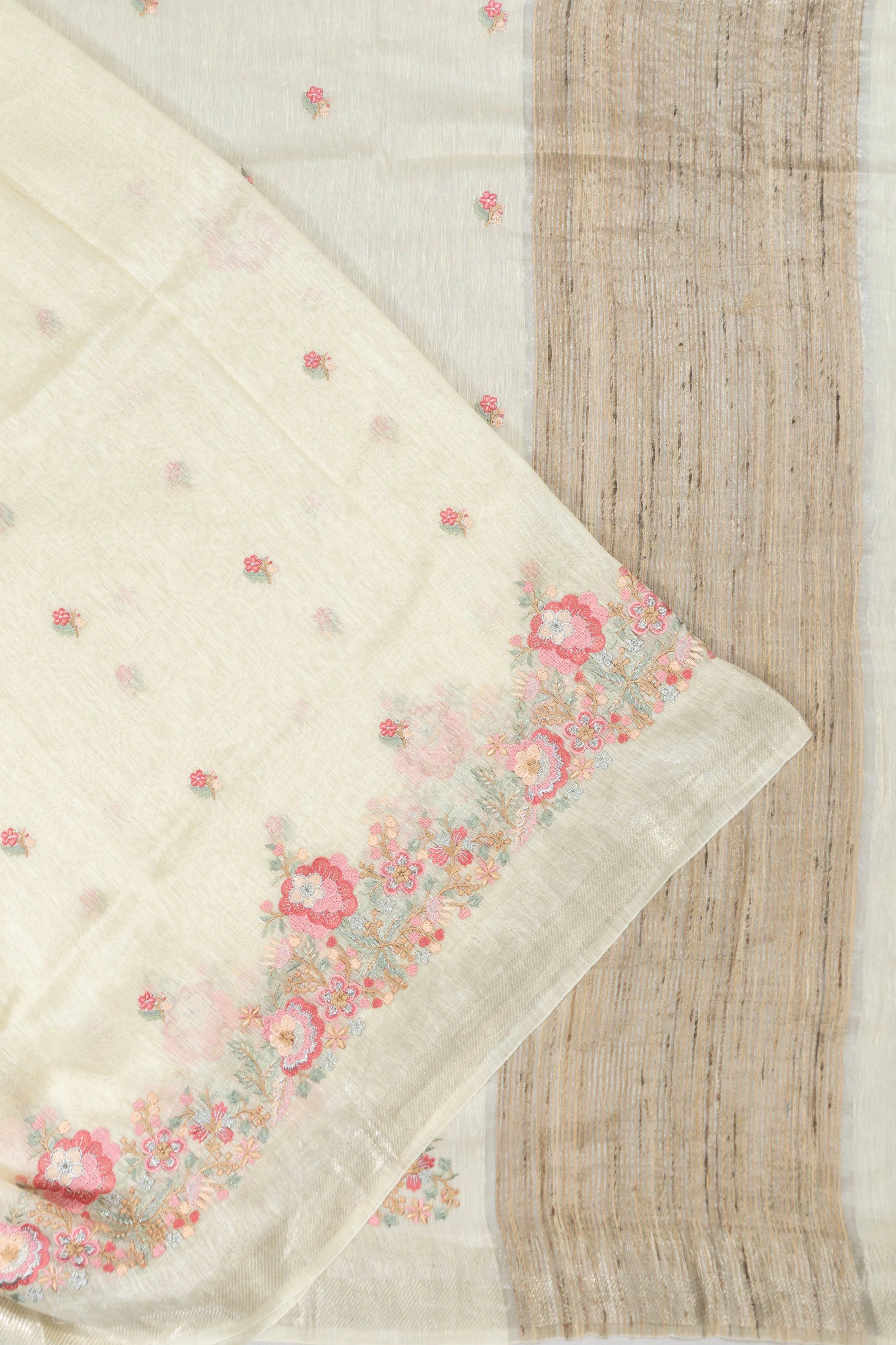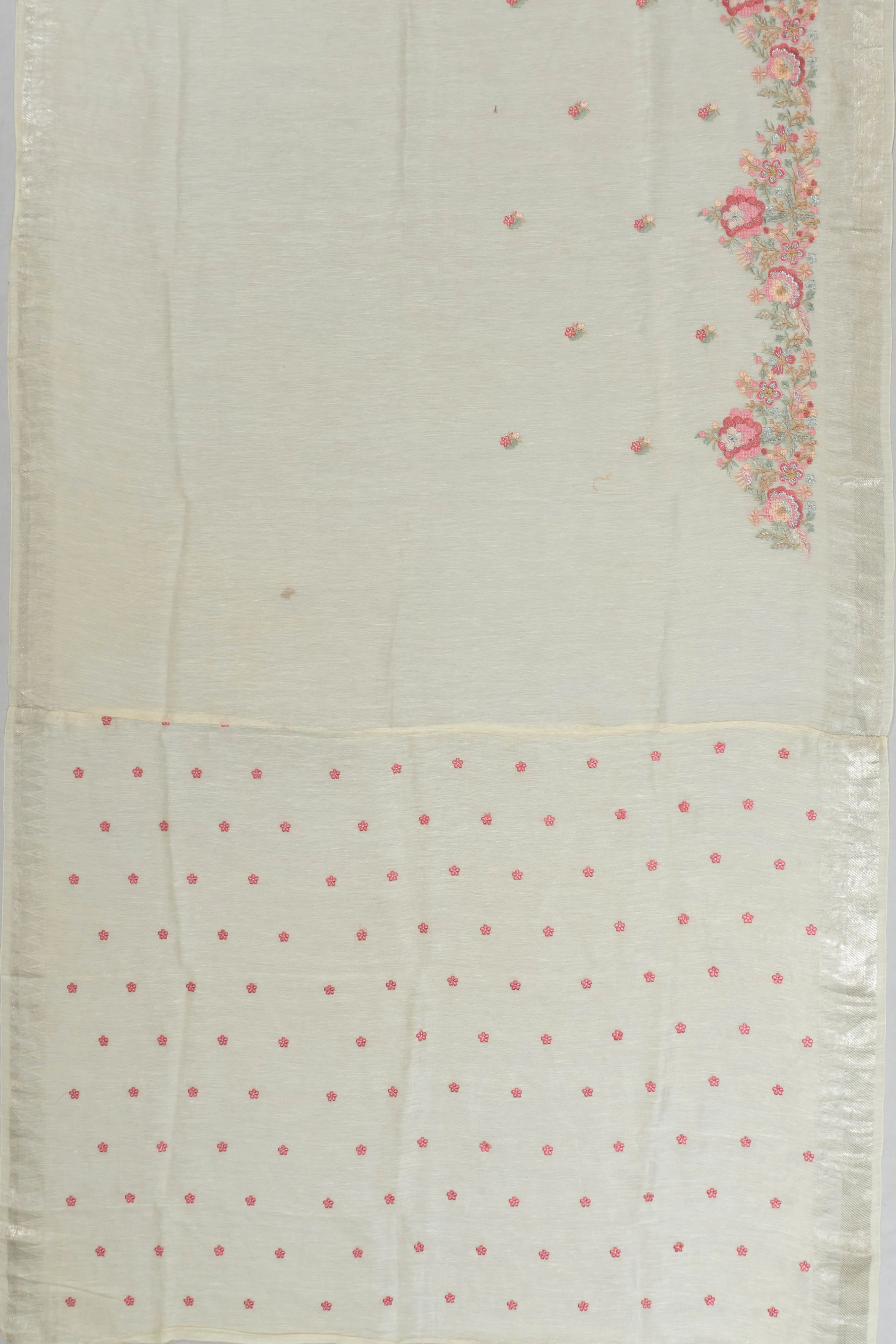 The self multicolour floral embroidery border with silver zari kaddi creates a harmonious frame, adding a touch of radiance to this elegant ensemble