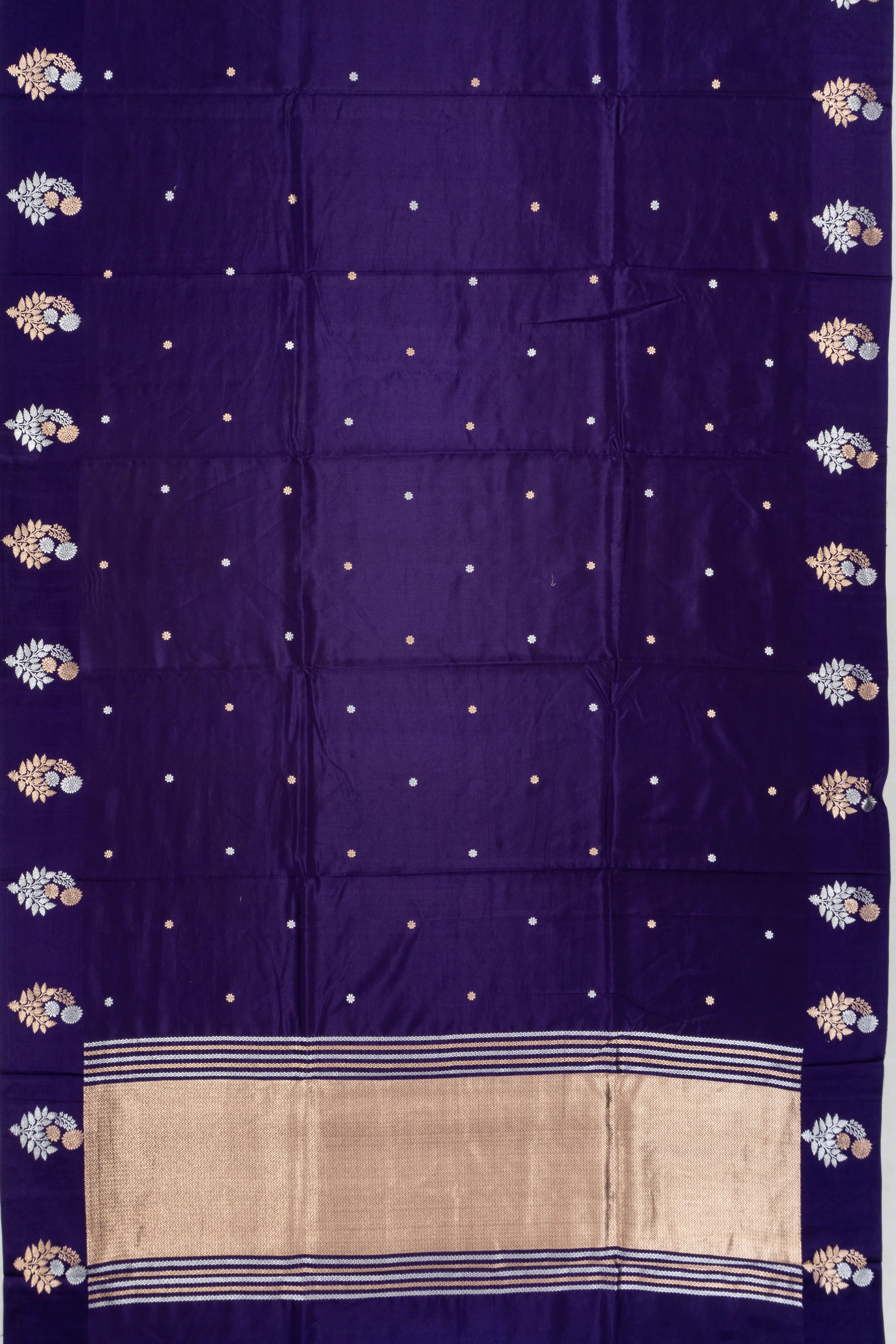 Paired with a coordinated blouse, embellished with gold and silver zari floral buttas, this saree ensemble captures the essence of classic luxury