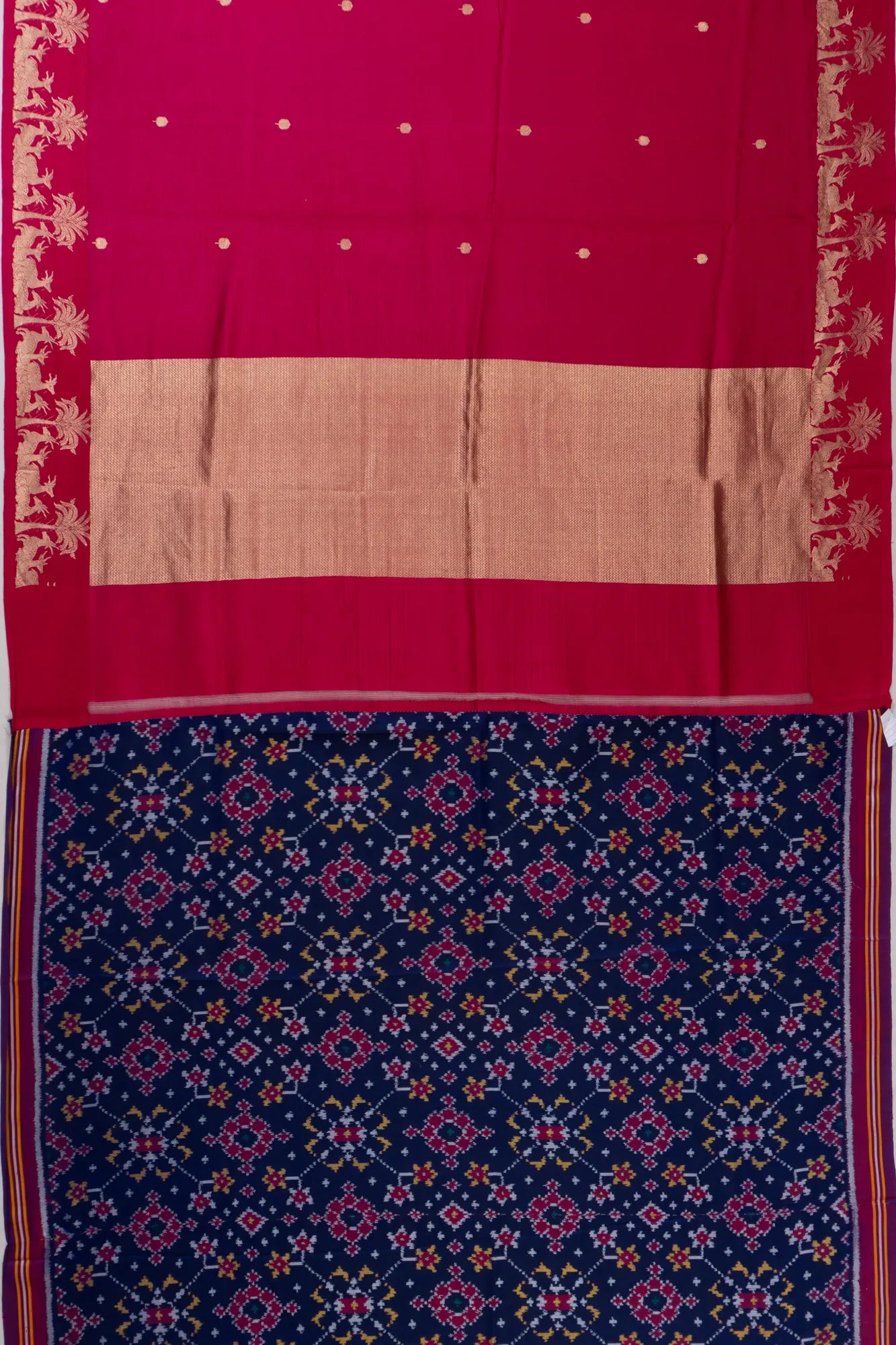The self gold zari brocade border, enriched with subtle yet graceful deer motifs, adds a touch of sophistication and charm