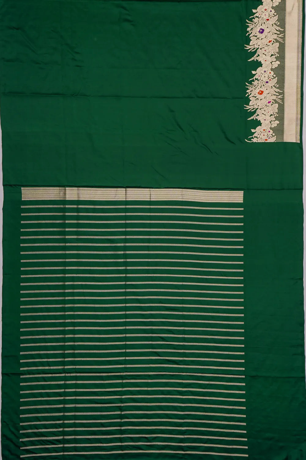 The deep bottle green hue of the saree is beautifully offset by intricate zari detailing, embodying the timeless elegance of Banarasi craftsmanship