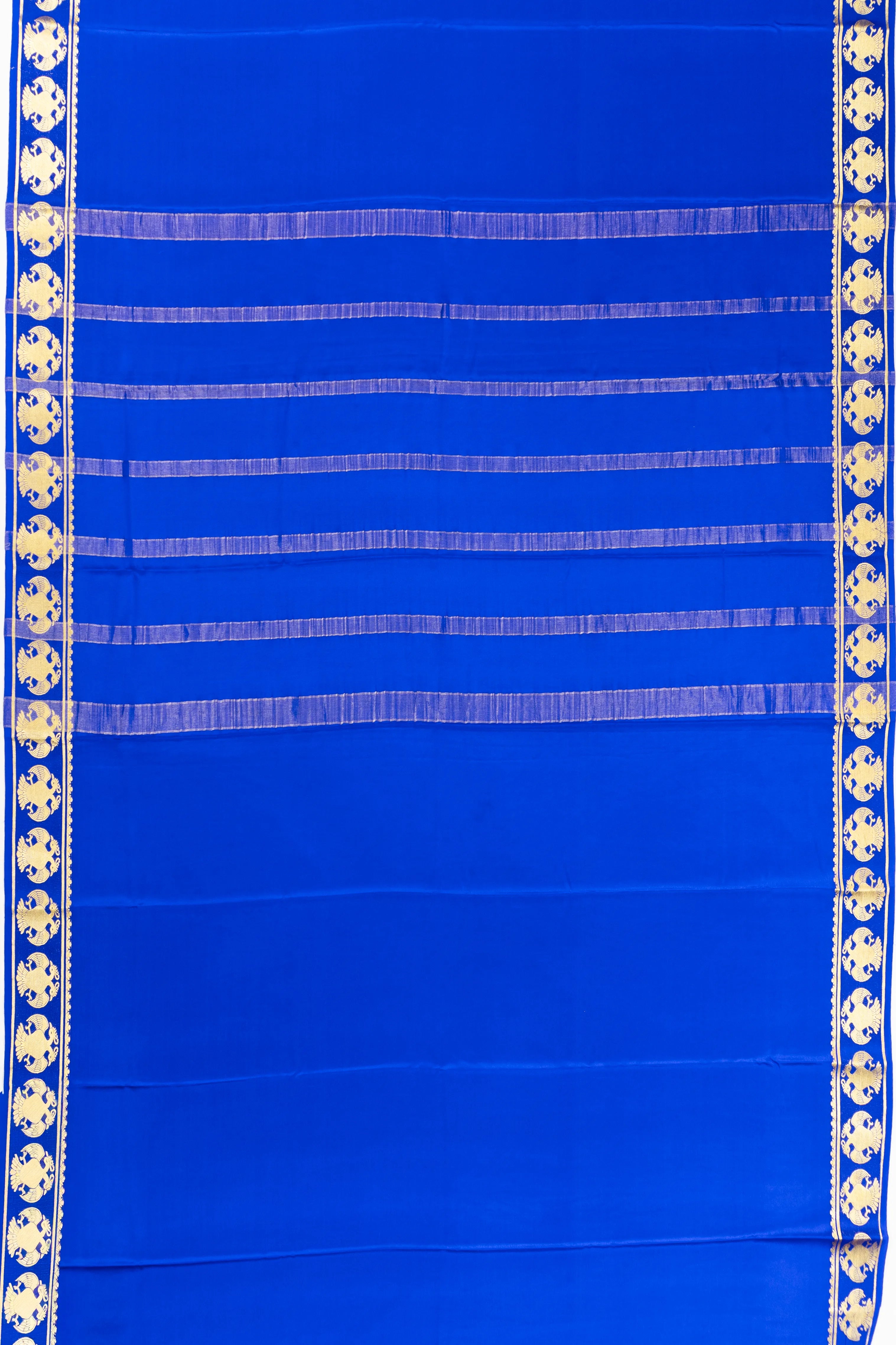 The saree's body is elegantly plain, allowing the rich royal blue silk to speak for itself, while the self gold zari gandhabharunda motifs along the brown small border add a touch of opulent detail