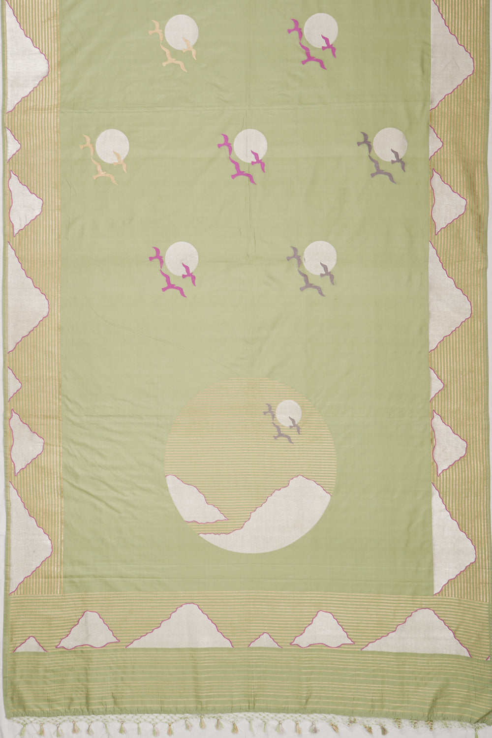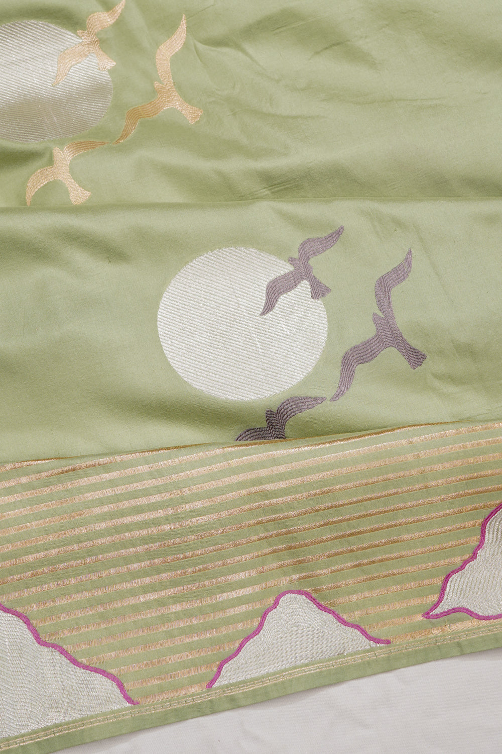 The saree features a self silver zari border enriched with mountain motifs and gold zari horizontal lines, adding a refined touch to its overall allure