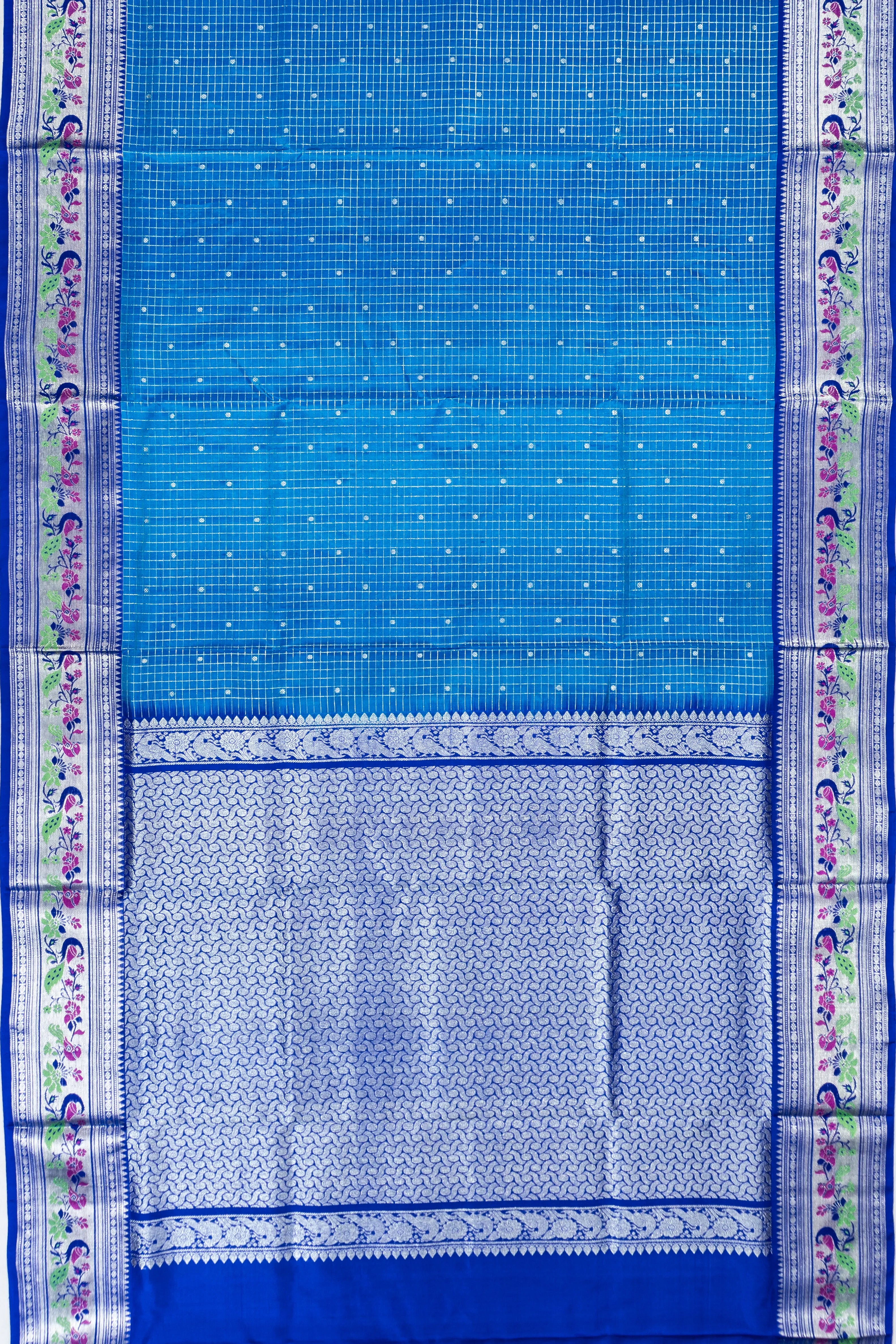 The body features exquisite silver zari checks intertwined with charming floral buttas, offering a luxurious texture and sheen that speaks of timeless craftsmanship