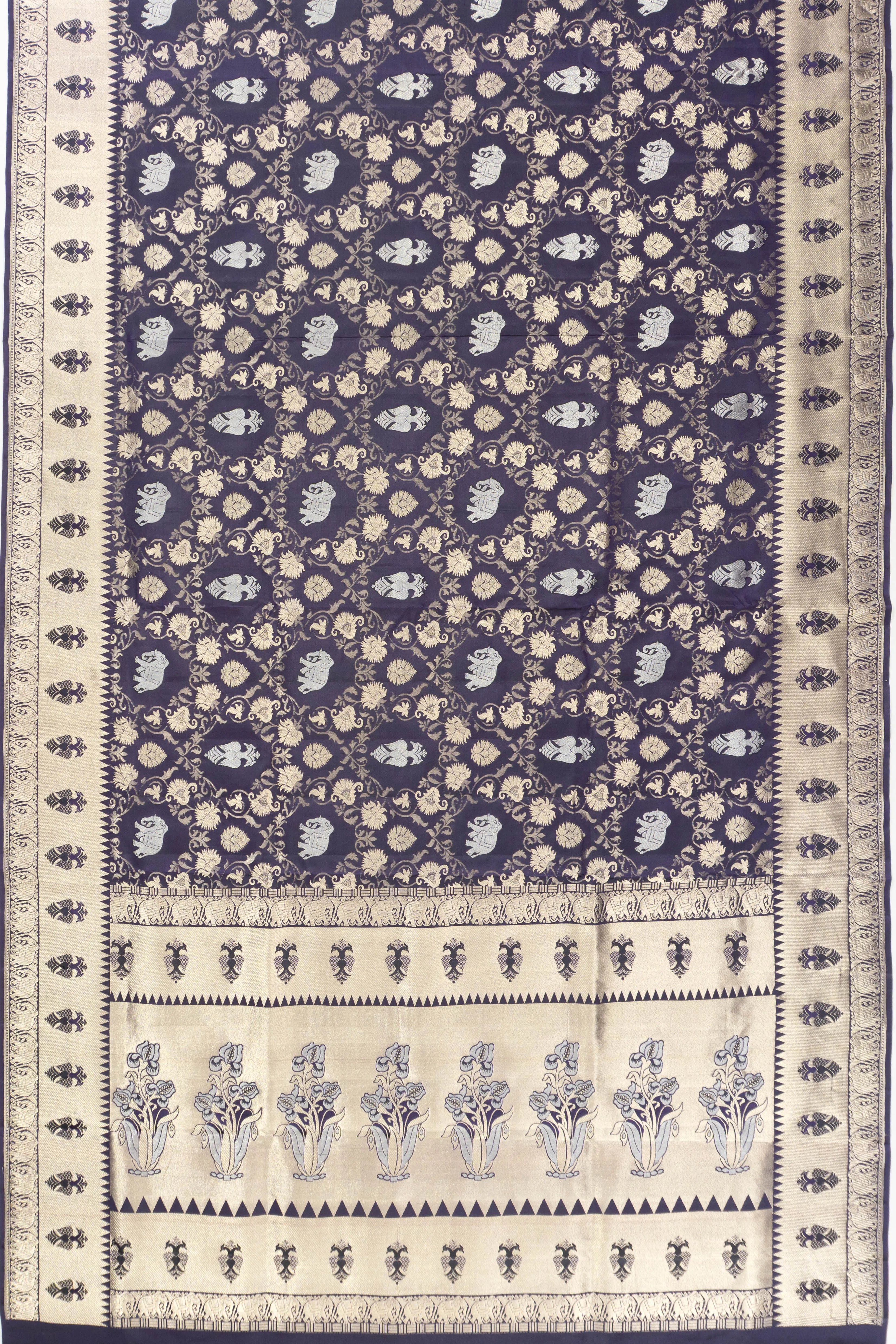 The pallu echoes this artistry with its gold zari tissue floral brocade, offering a rich tapestry of Gandabherunda and elephant motifs