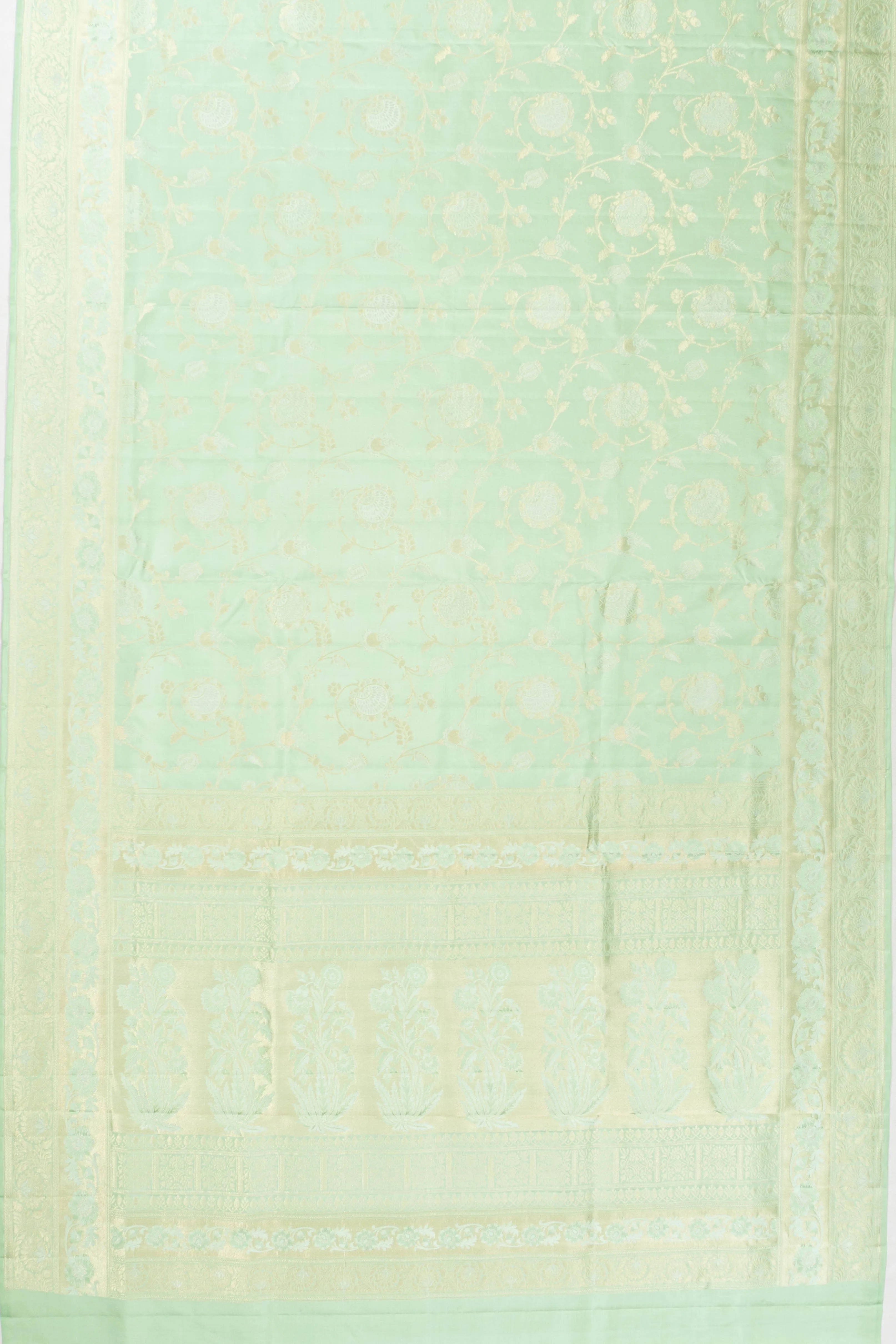 Its border features a subtle yet sophisticated self gold zari tissue, enhanced with charming floral vines, offering a seamless extension of the saree's graceful design