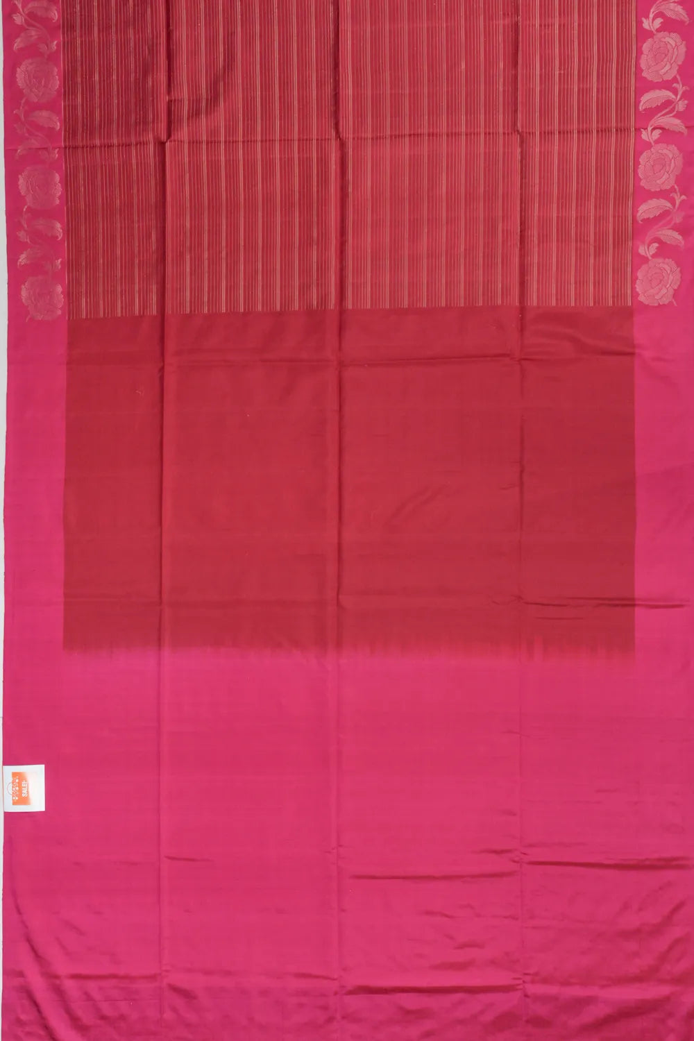 The pallu is adorned with a silver zari floral brocade, creating a harmonious blend of tradition and splendor