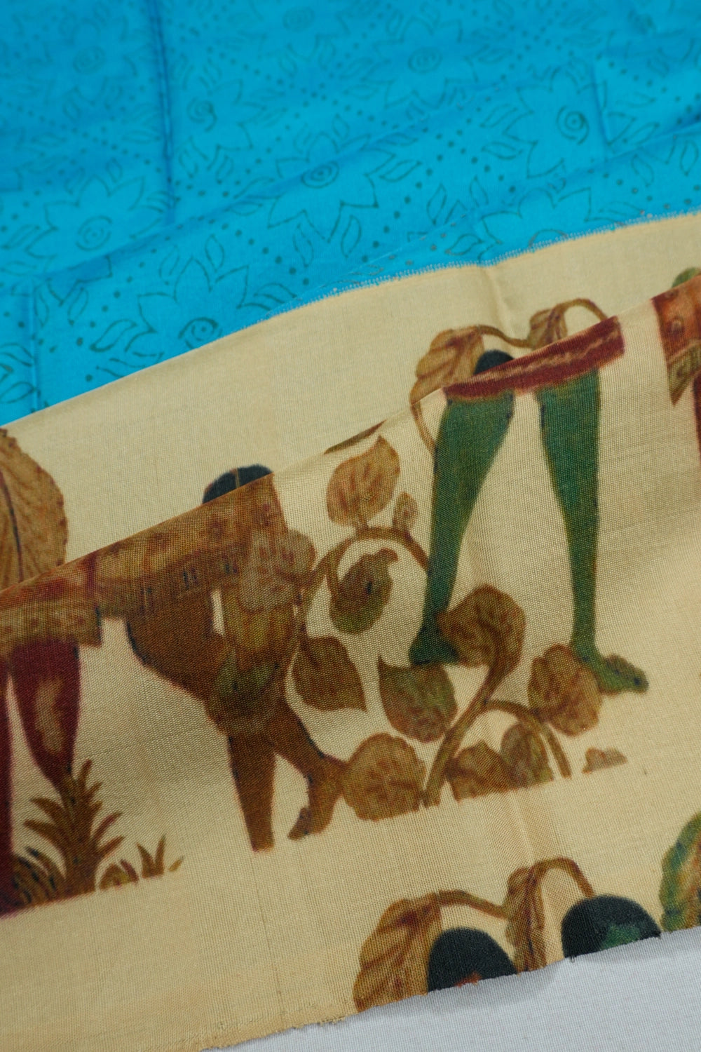 The saree is adorned with a striking cream border, featuring a big printed design that enhances its grandeur without the need for zari