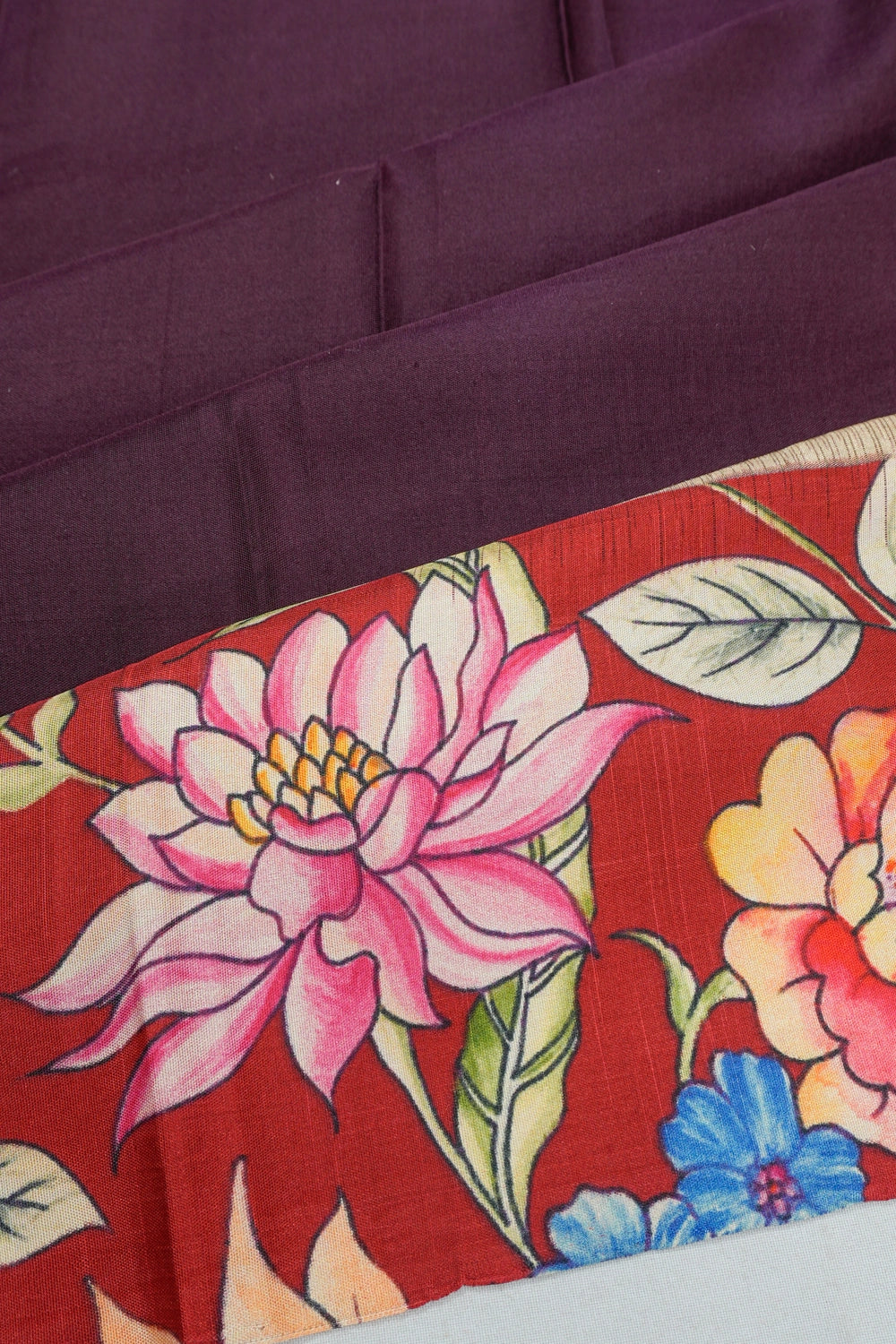A highlight of this saree is its contrast floral printed silk border, enhancing its visual appeal with delicate motifs that dance across the fabric, creating a timeless silhouette