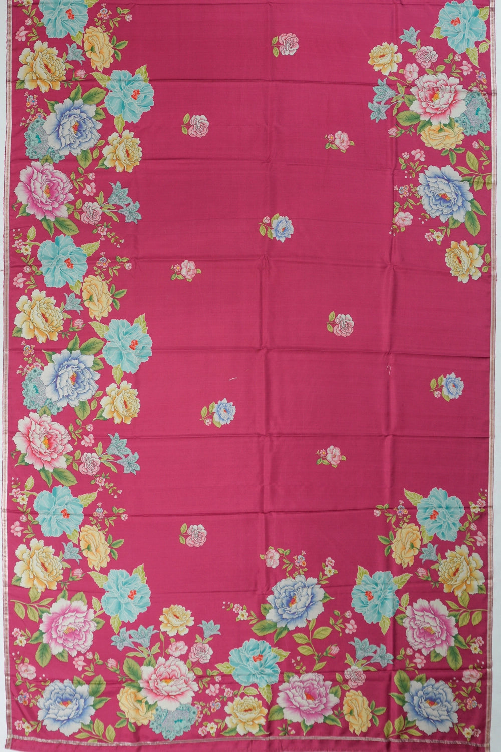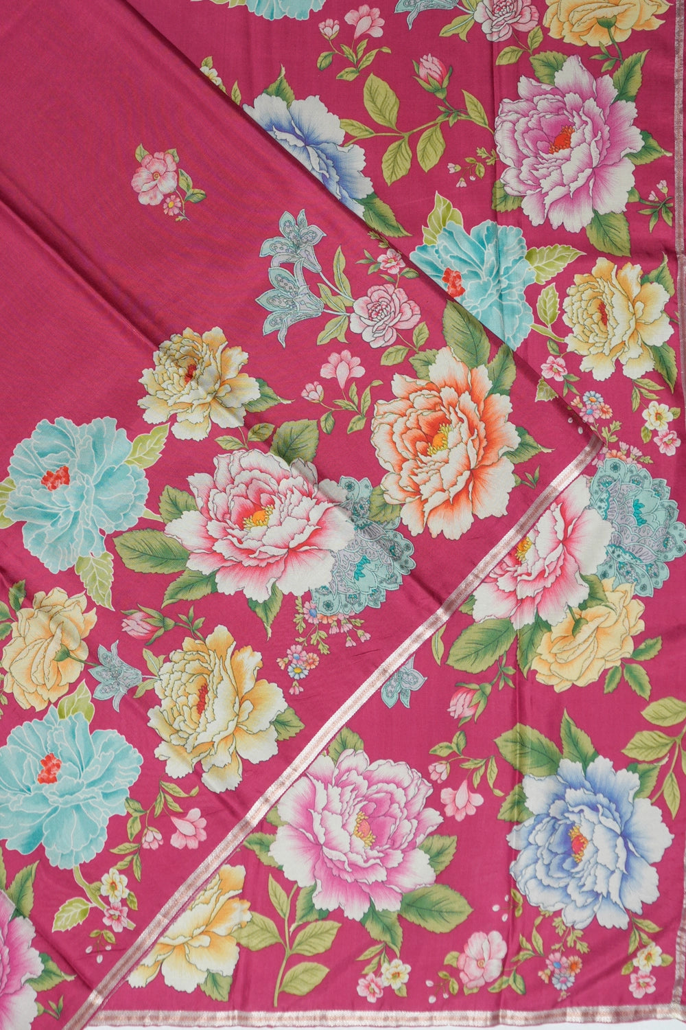 The rich dark pink hue is adorned with exquisite zari floral embroidery along the small self-border, elevating its heritage charm