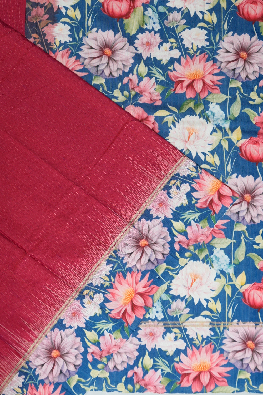 The saree's body showcases a delicate floral print, rendered in the finest silk, offering a luxurious feel and an elegant drape that epitomizes timeless beauty