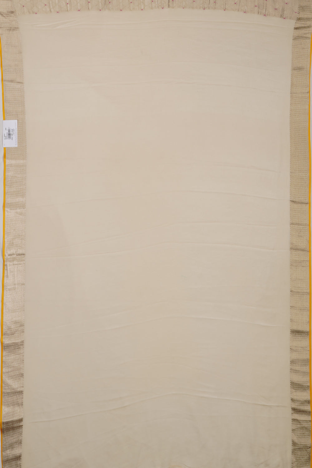 A self silver zari border with a subtle yellow edge enhances the saree's elegance, while the pallu continues the theme of refined simplicity, creating a seamless flow of design and color