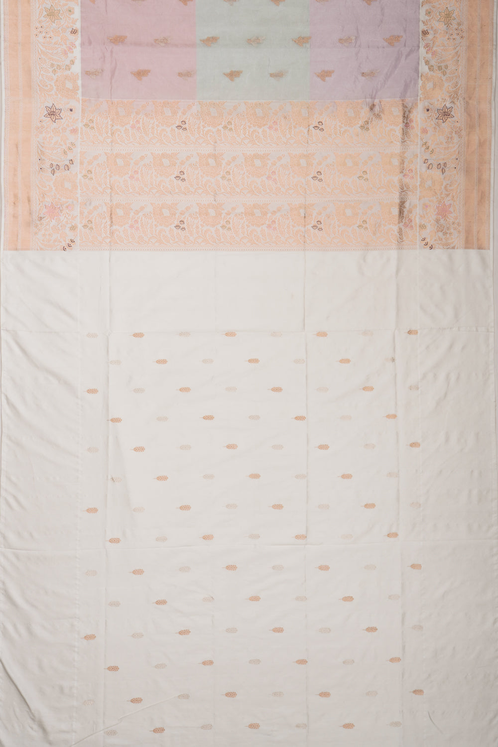 A contrast gold zari white border adds a touch of opulence, elevating the saree's elegance and lending a timeless charm