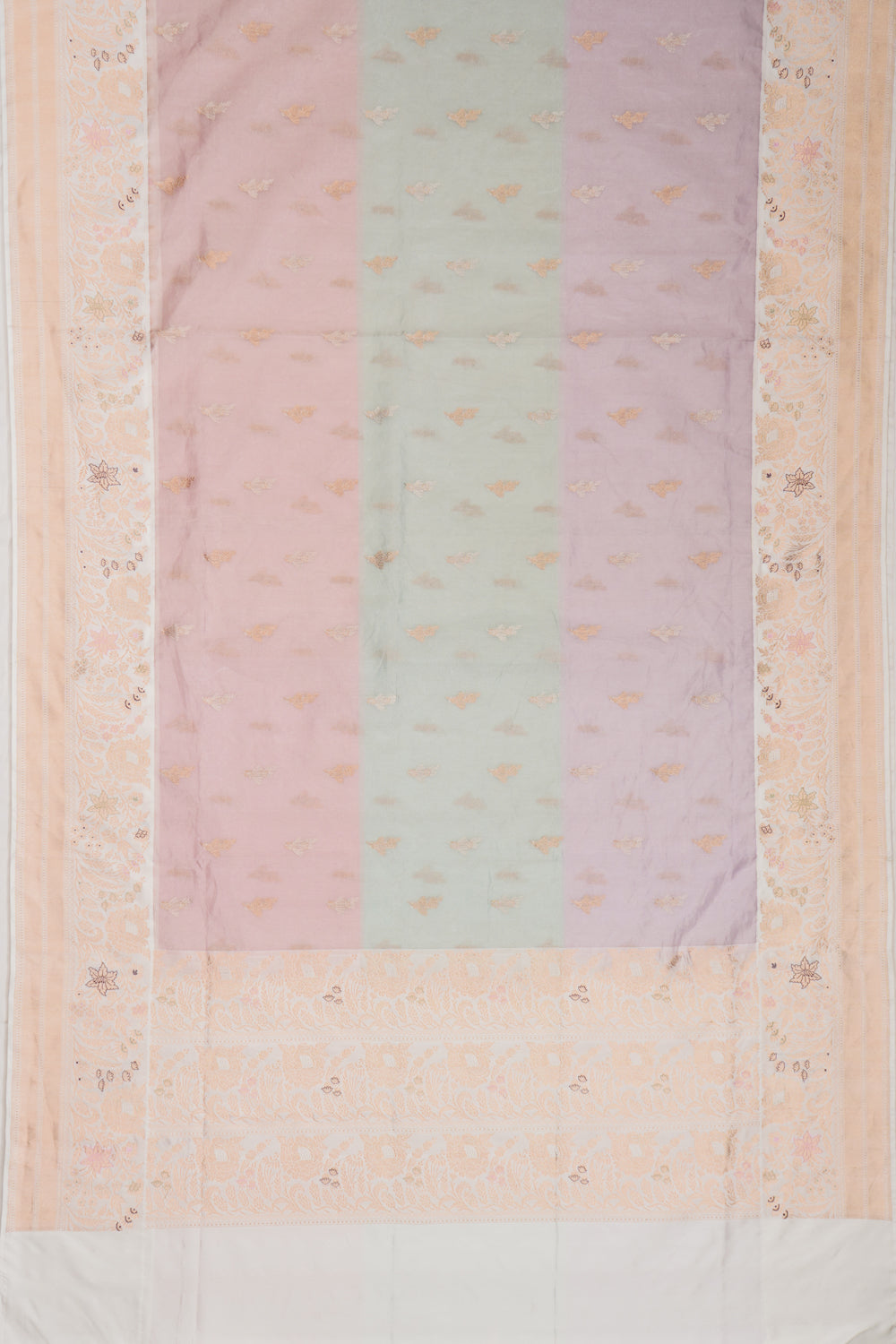 The saree's body is adorned with multicolored buttas that dance gracefully across the fabric, offering a vibrant yet sophisticated visual appeal