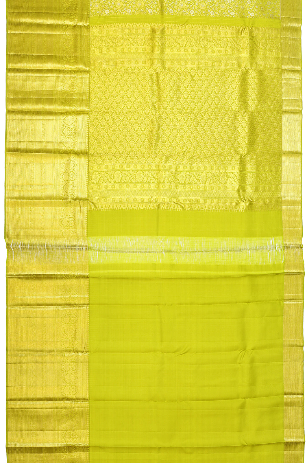 Embrace the allure of tradition with the Taranga Kanchi Silk Brocade Green Saree, a masterpiece in heritage-rich craftsmanship The saree's body is adorned with a lavish gold and silver zari floral brocade, exuding a graceful charm and elegance