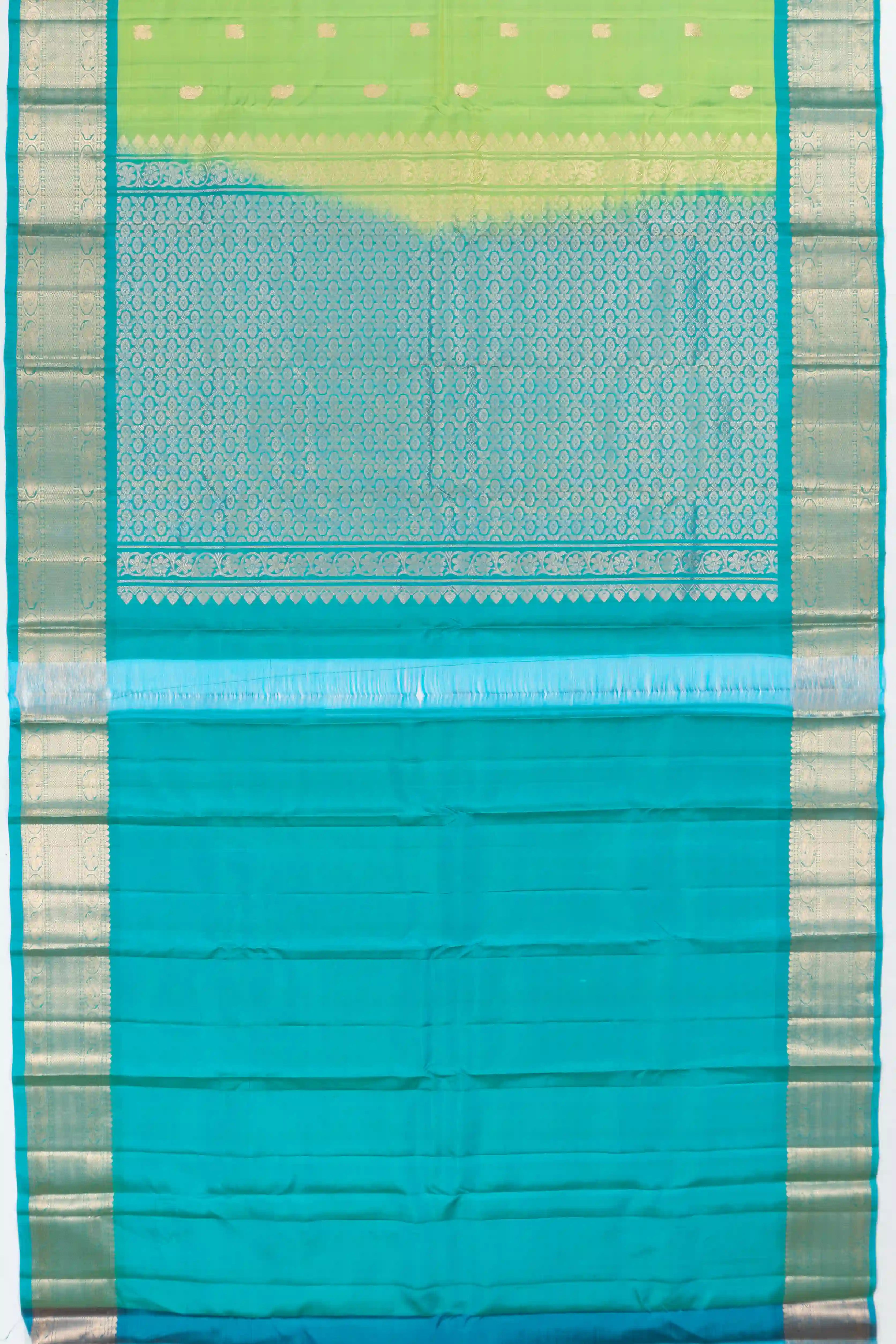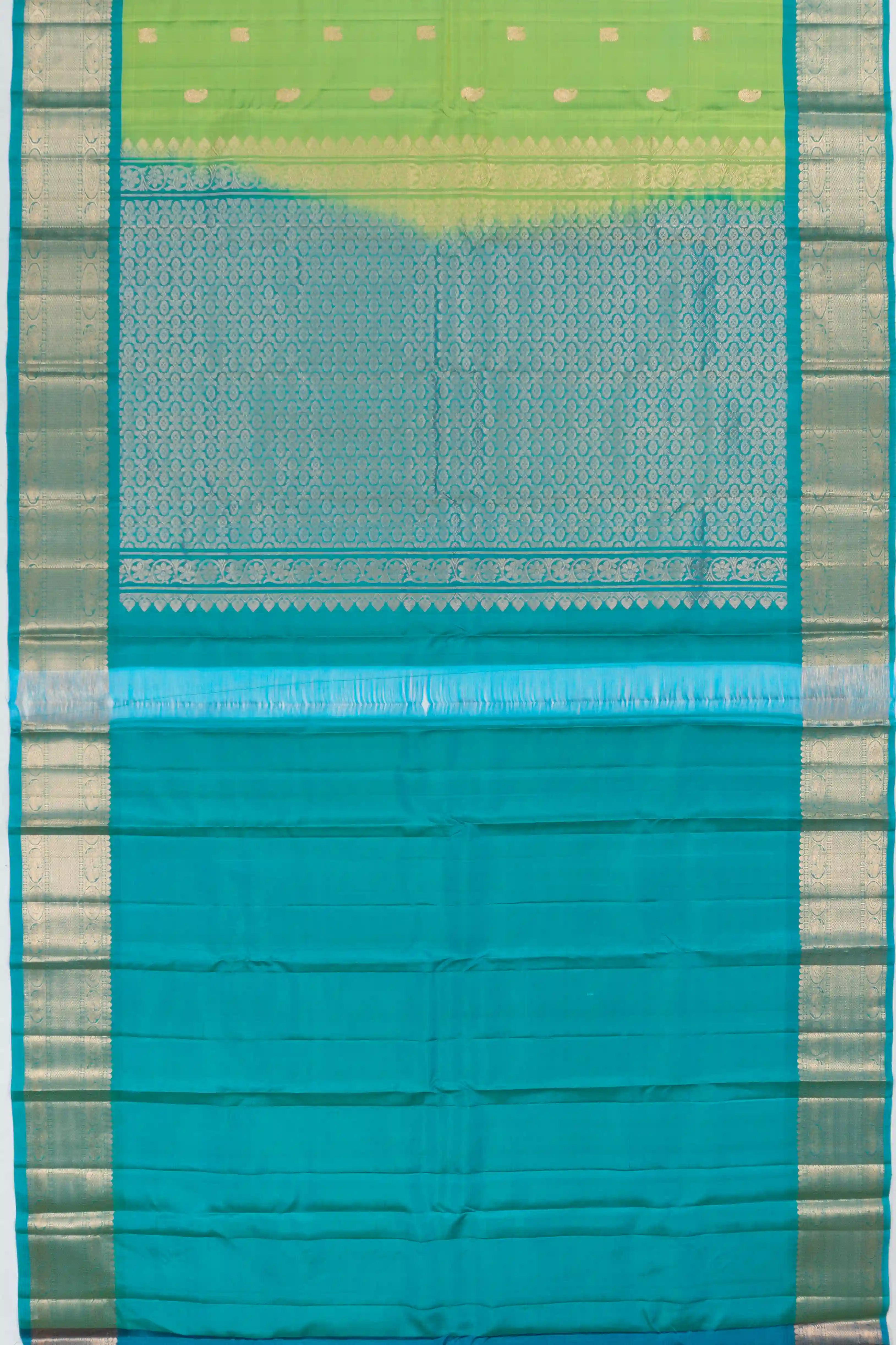 The saree's lush green body is adorned with delicate butta motifs, offering a touch of sophistication and grace to your ensemble