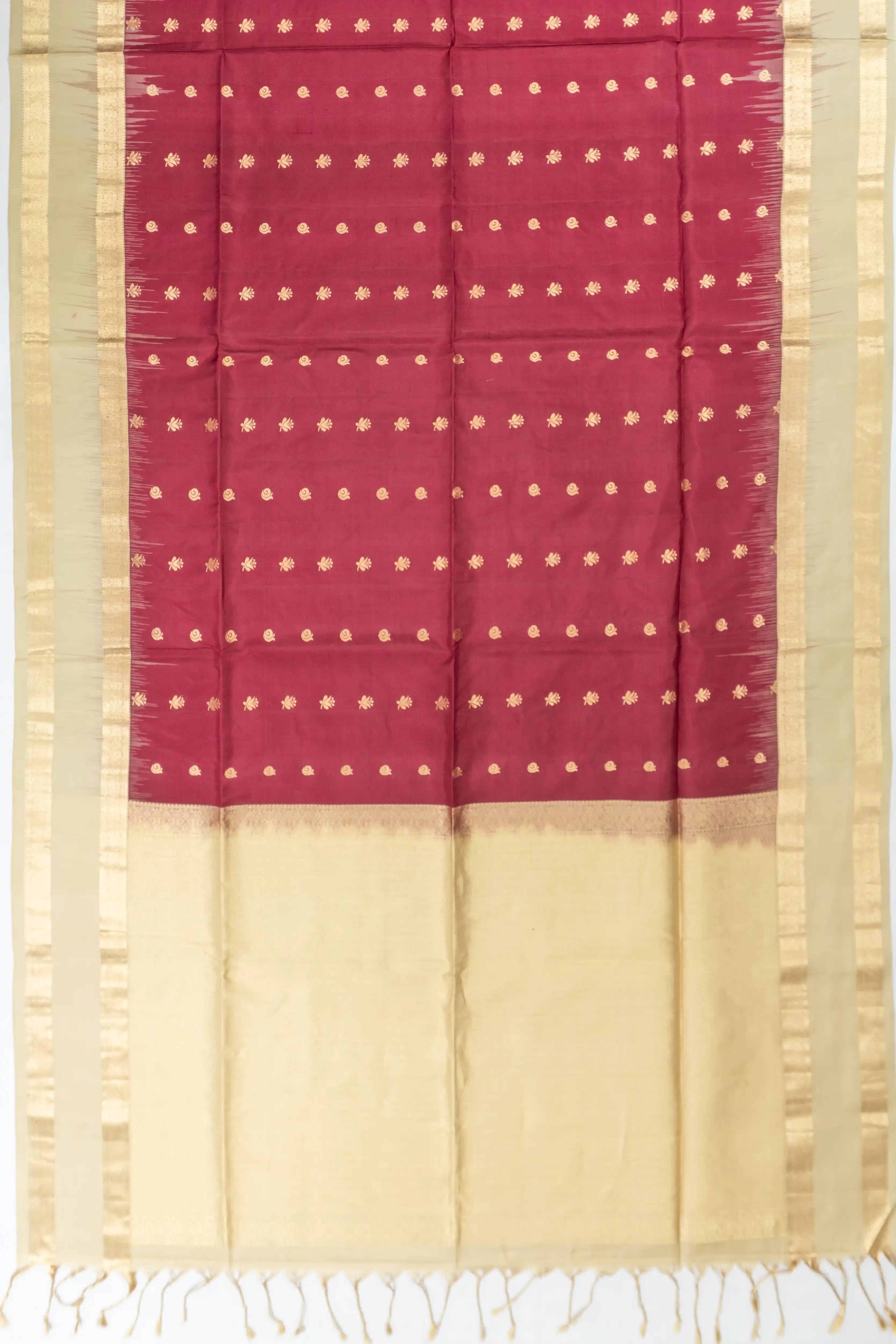 The maroon body is adorned with delicate buttas, creating a graceful tapestry of elegance, perfect for any grand occasion