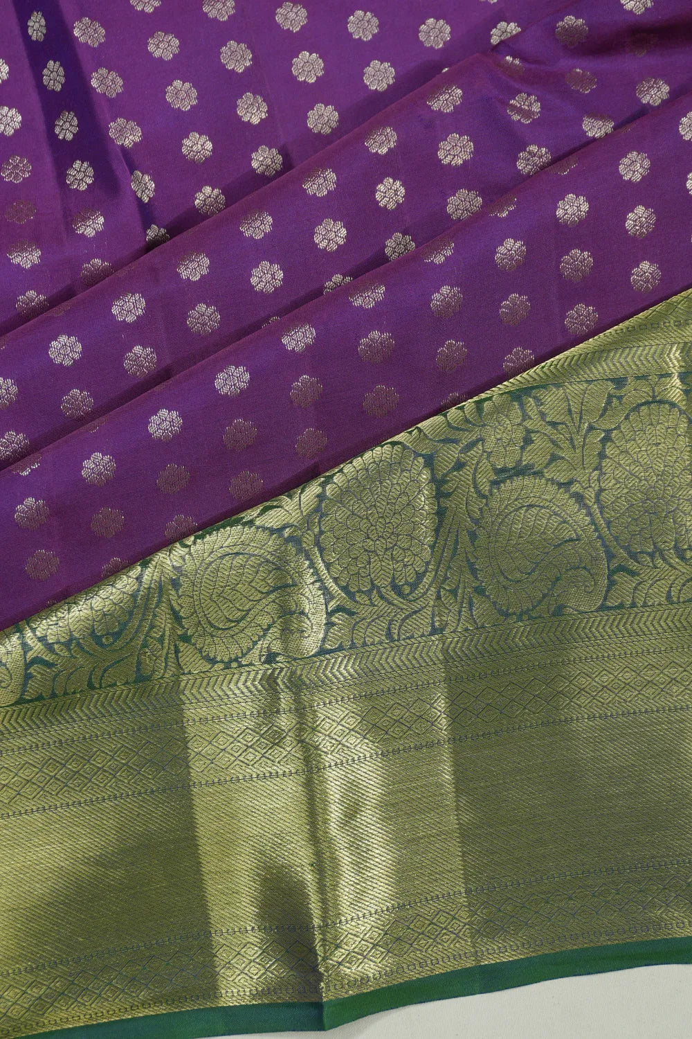 The body of the saree is adorned with exquisite buttas, woven meticulously into rich purple silk, offering a touch of timeless elegance