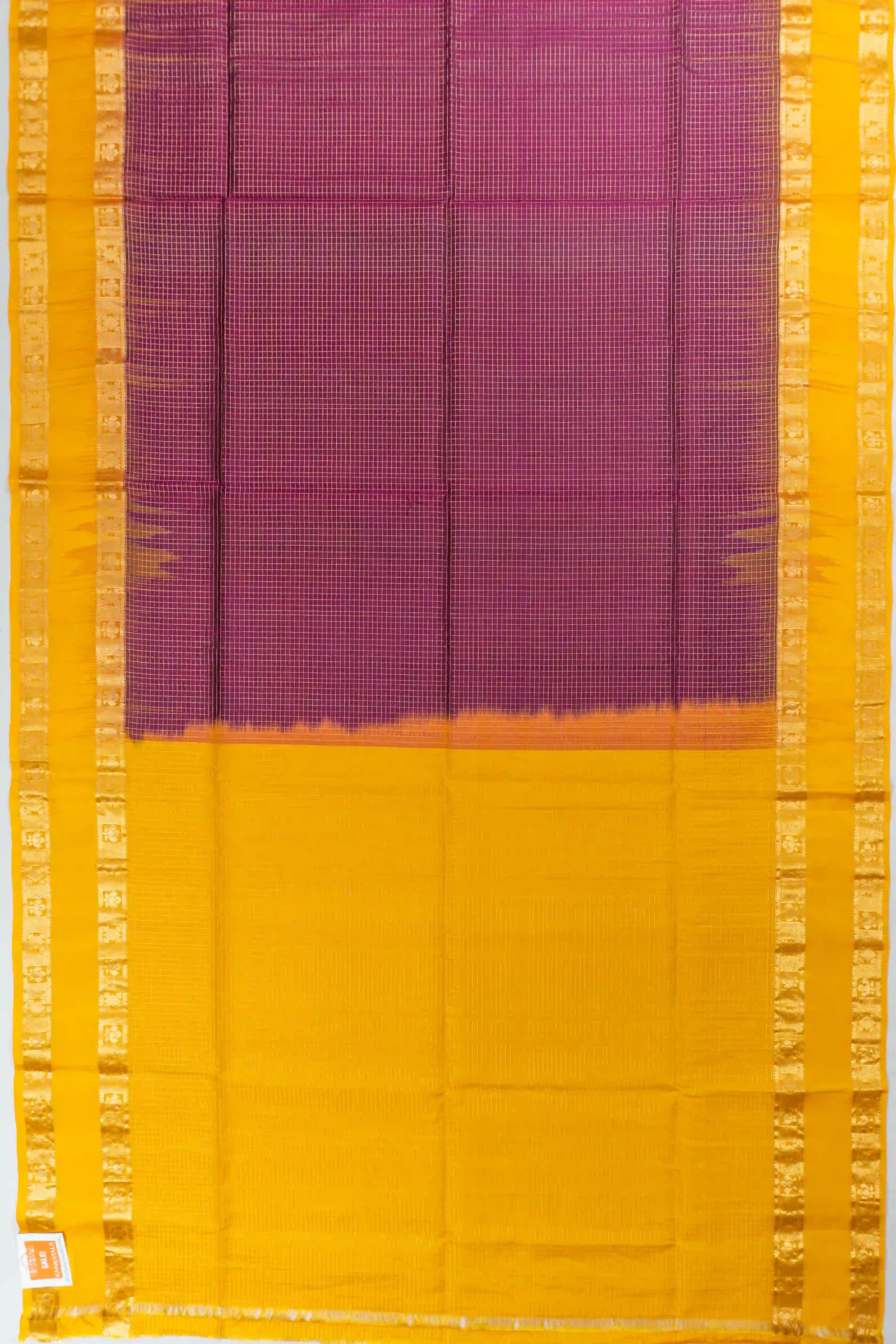 The saree's body is adorned with intricate checks, offering a delightful interplay of texture and color that captivates the eye