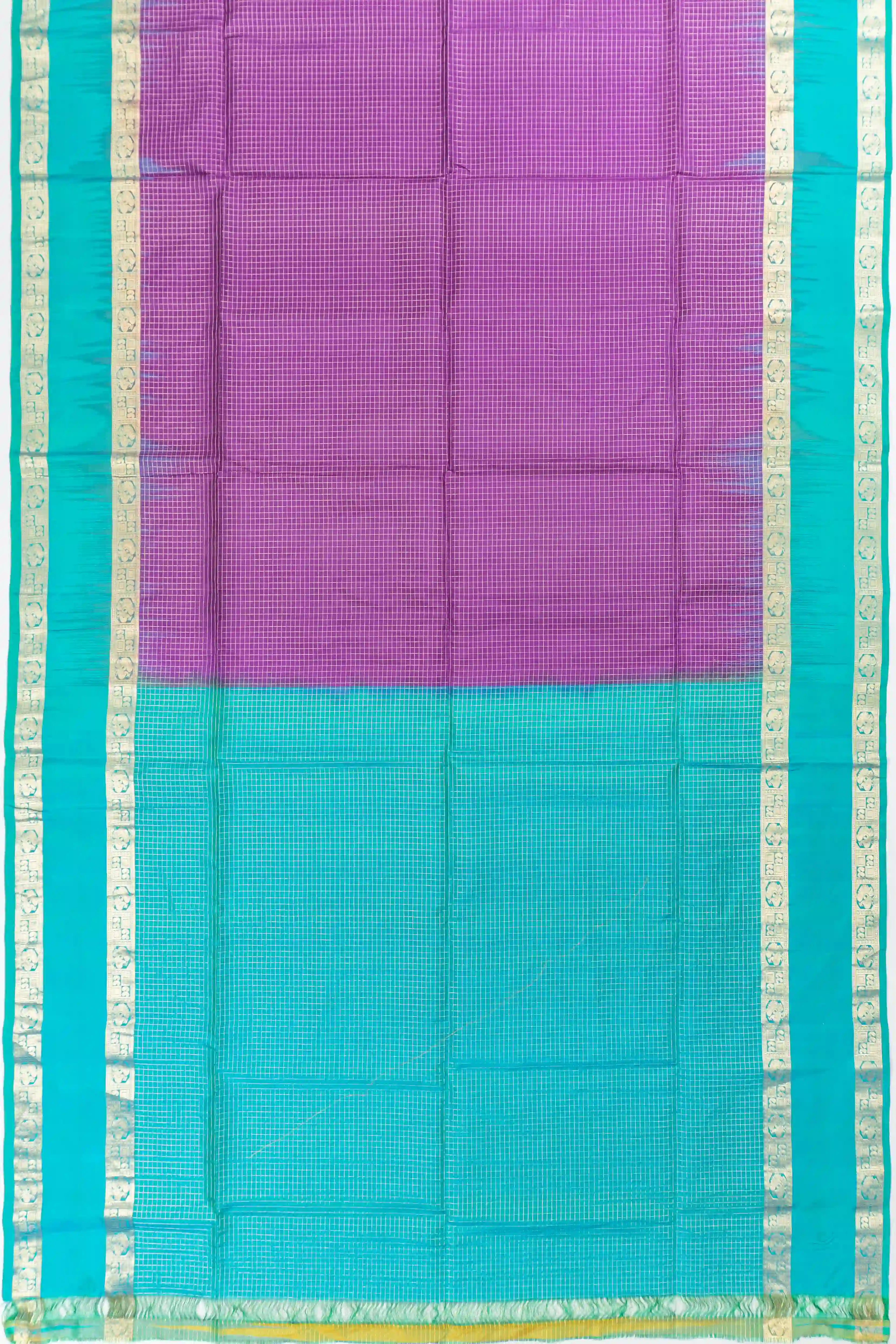 The saree's body features a harmonious blend of checks in a rich purple hue, exuding a sense of regal charm and sophistication