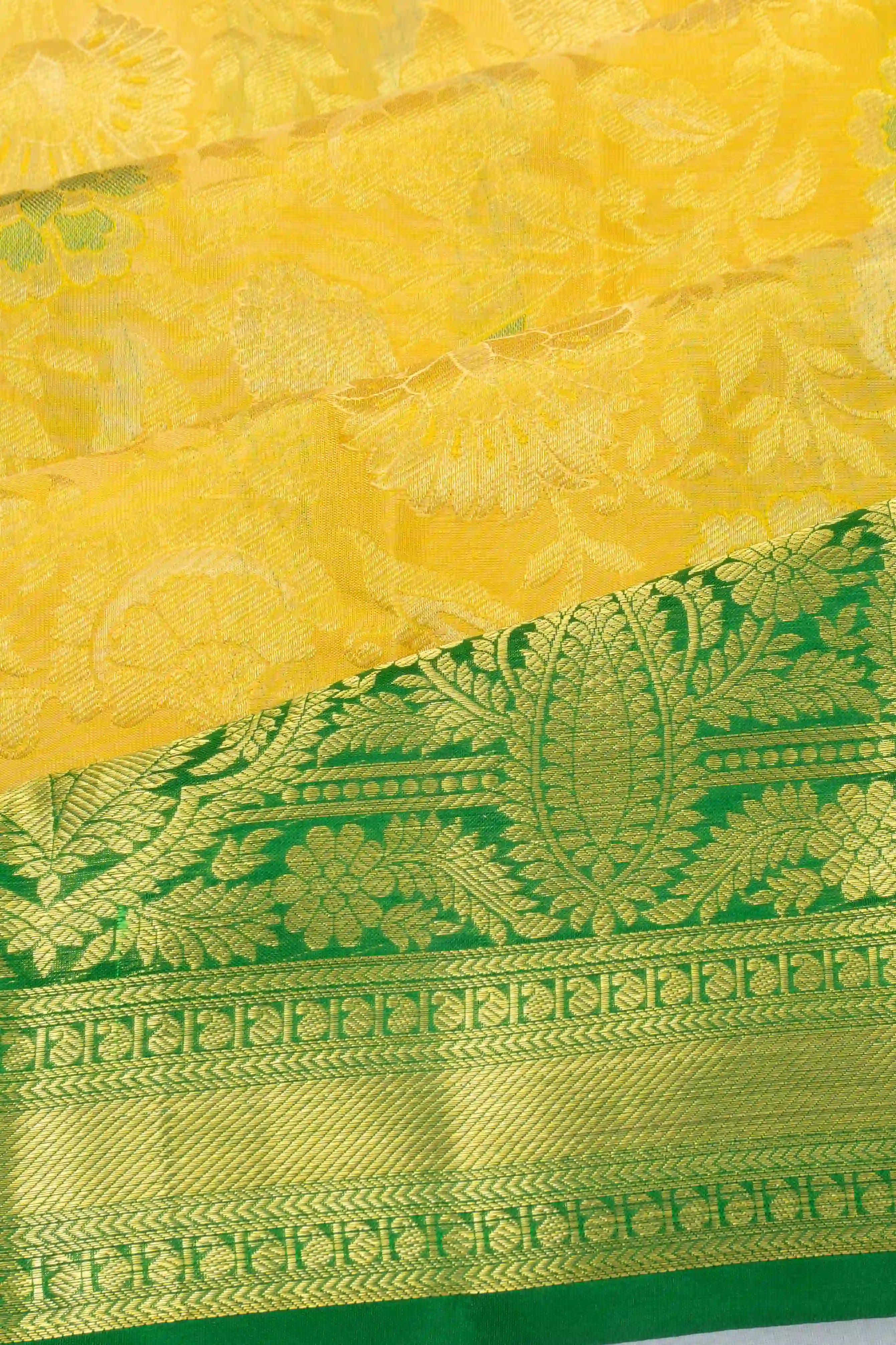 The saree's body, in a vibrant yellow hue, exudes a radiant charm, perfectly enhanced by the intricate silk jaal motifs that speak of timeless elegance