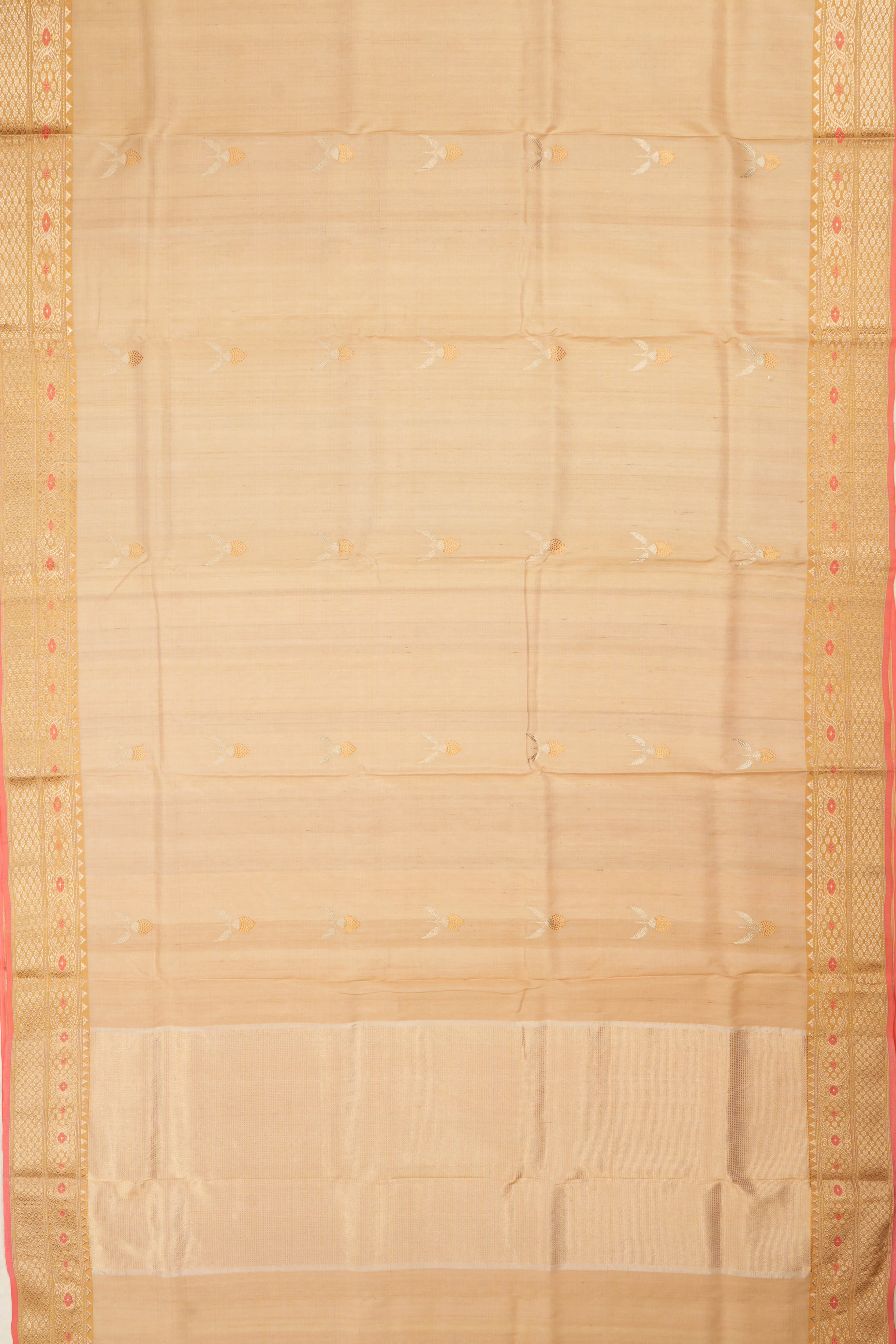 Body: Soft beige Katan silk adorned with silver zari floral buttas, delivering a graceful and refined appearance.