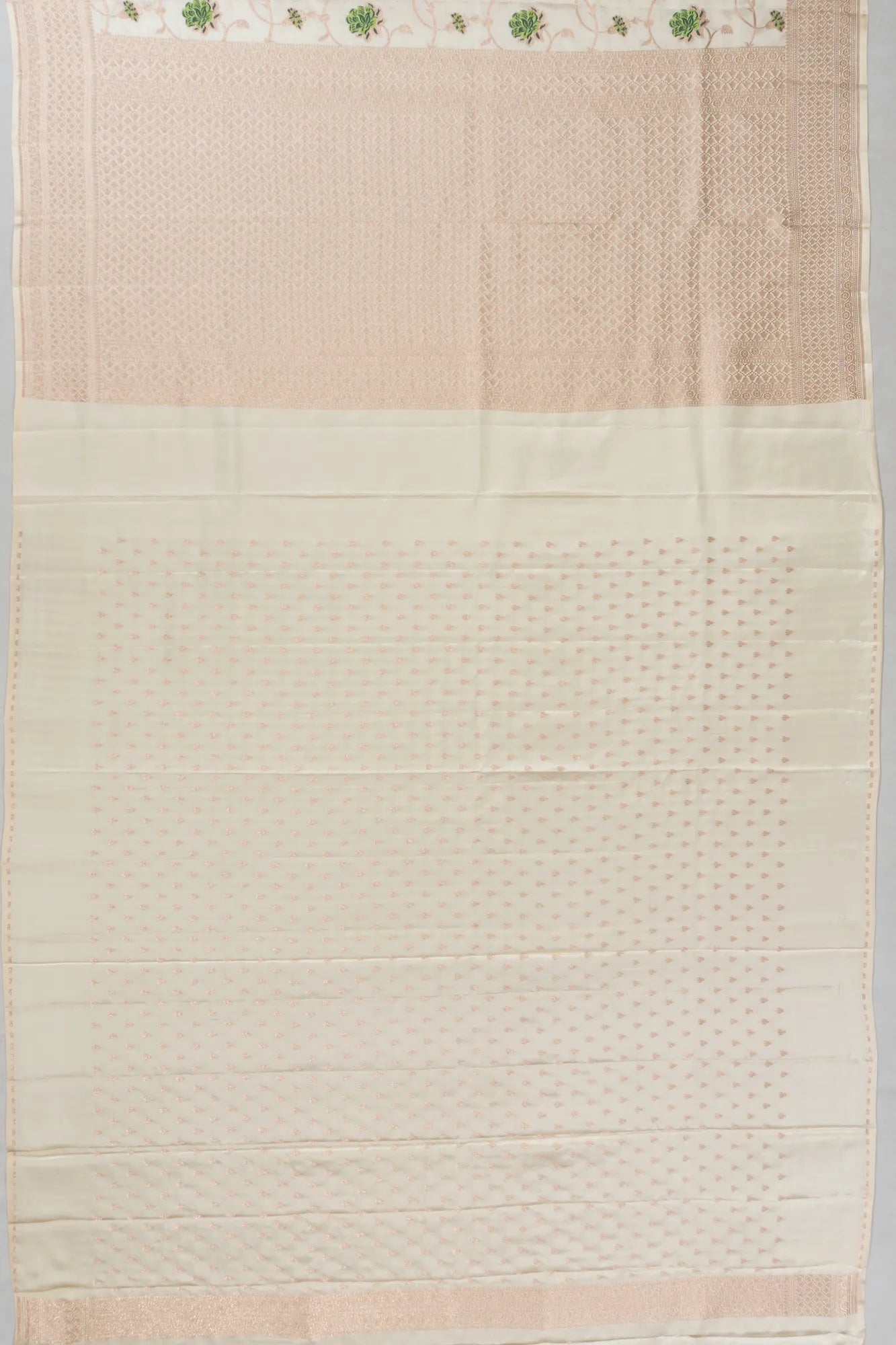 Enhancing its charm, the saree features a self gold zari floral brocade medium border, delicately interwoven with floral vines, creating a harmonious blend of sophistication and grace
