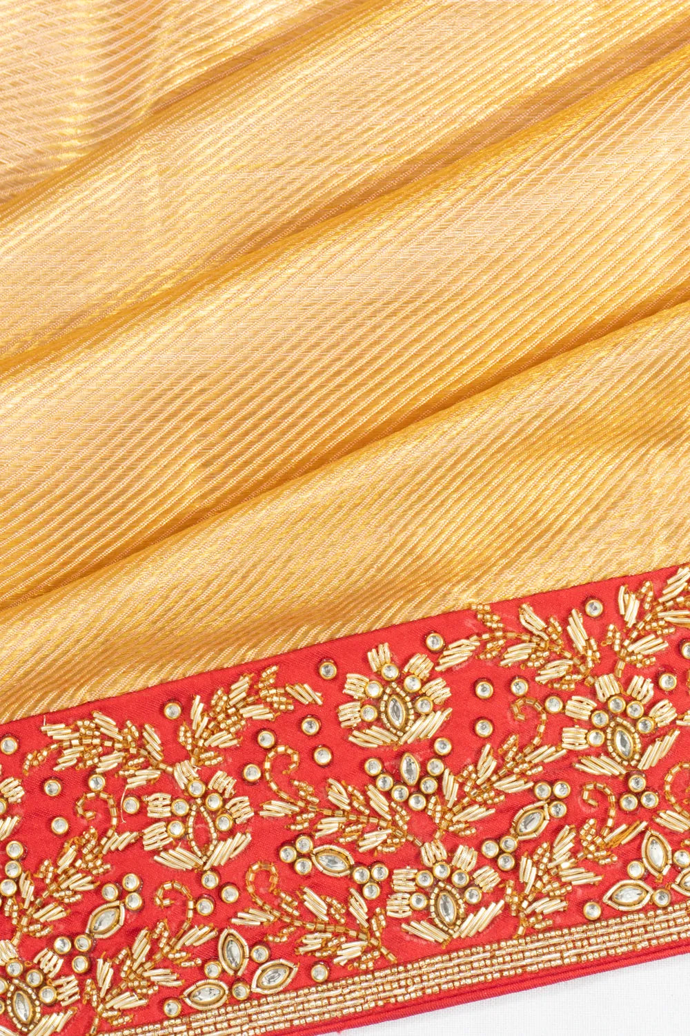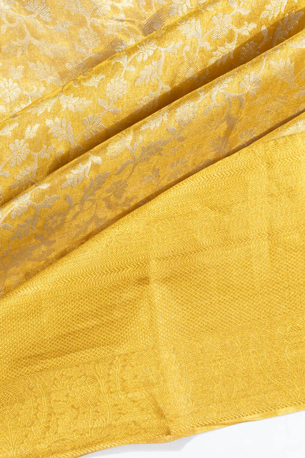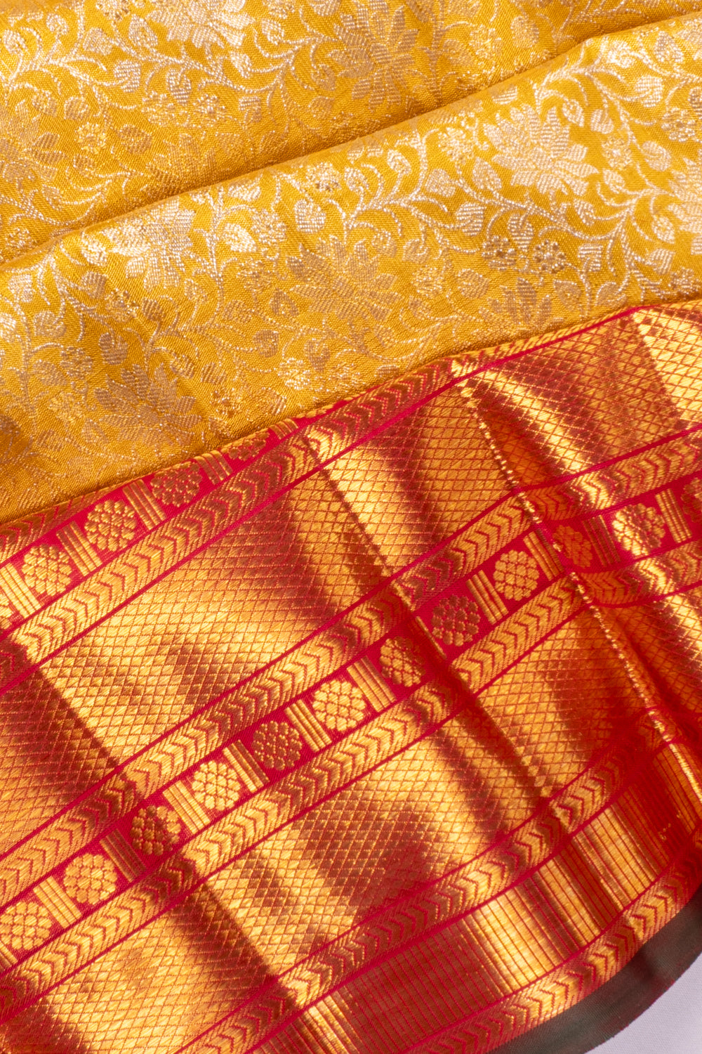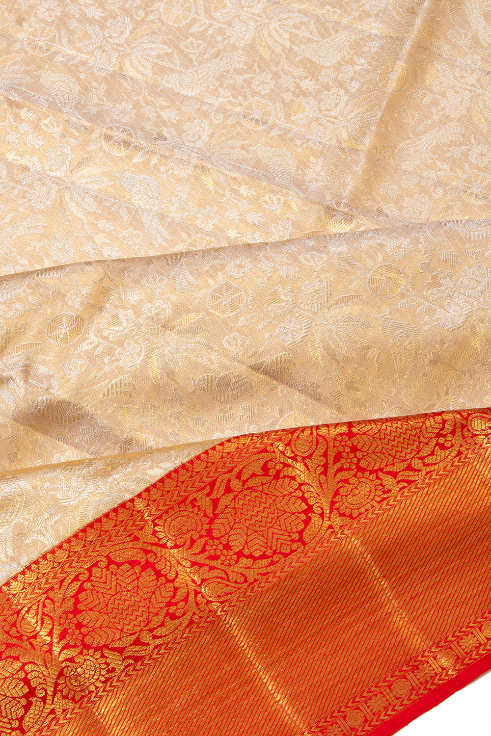 In order to identify Kanchi Tissue Pattu sarees, you first need to check the quality of the silk fabric and the zari used. To do so, many people use the burning technique but it is not an absolute test. You can also check to see if the loose zari threads are red in colour, as traditionally, the zari is mixed with silk strands and then dipped in gold. This ensures its purity. However, the simplest way to identify a pure golden tissue silk saree is to check for the government-approved silk mark.