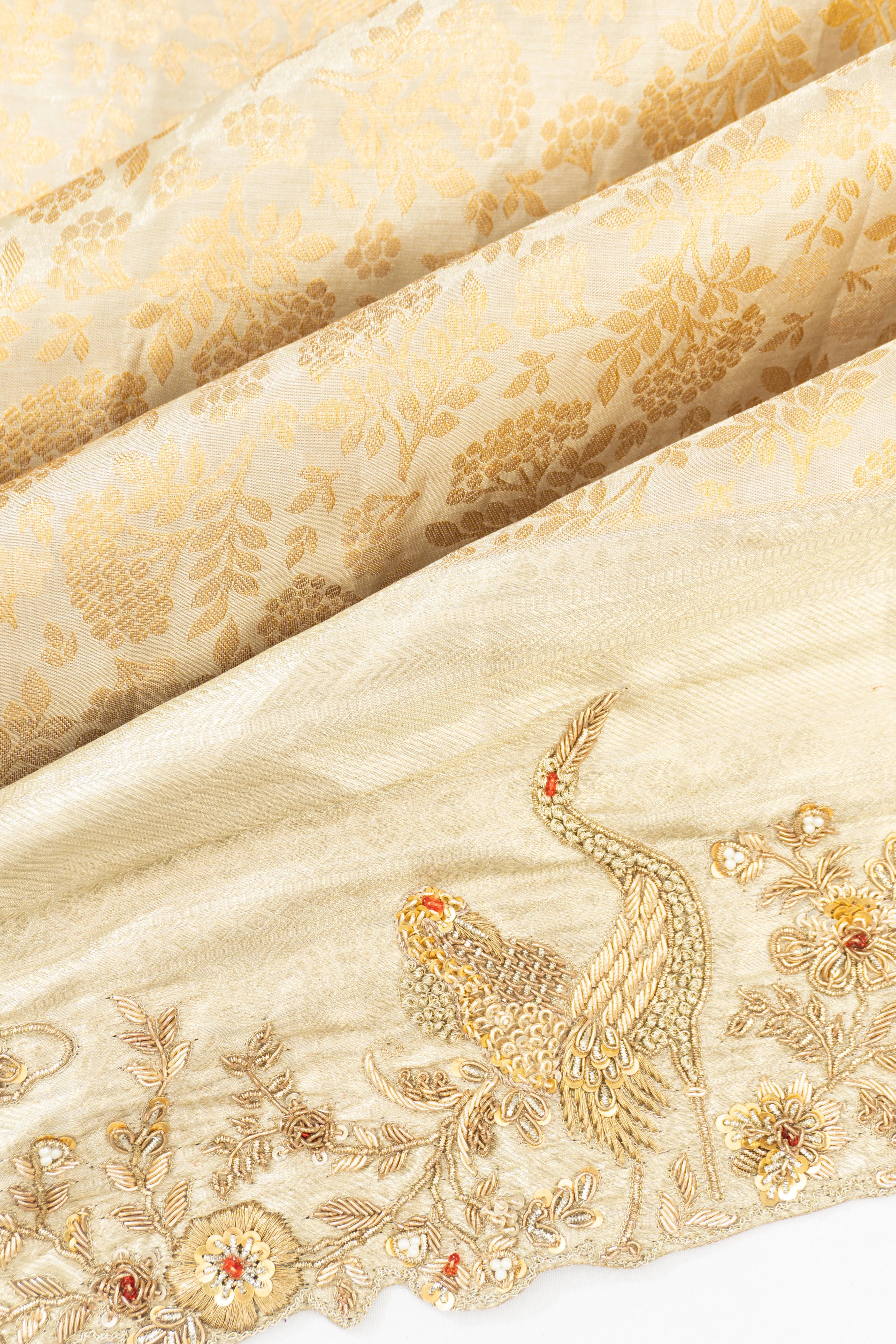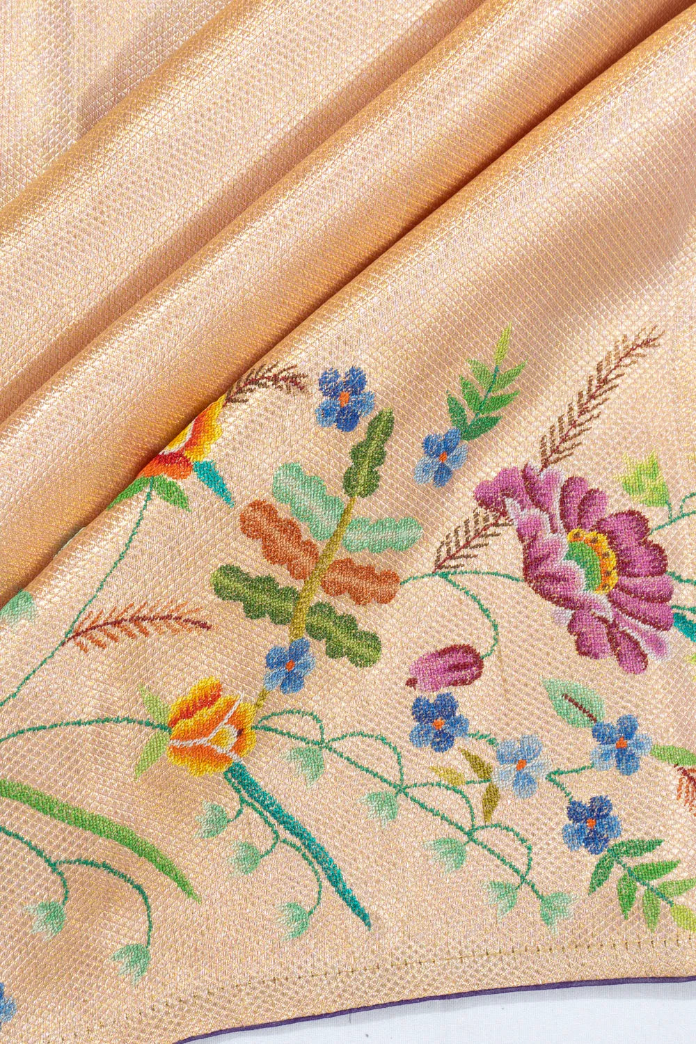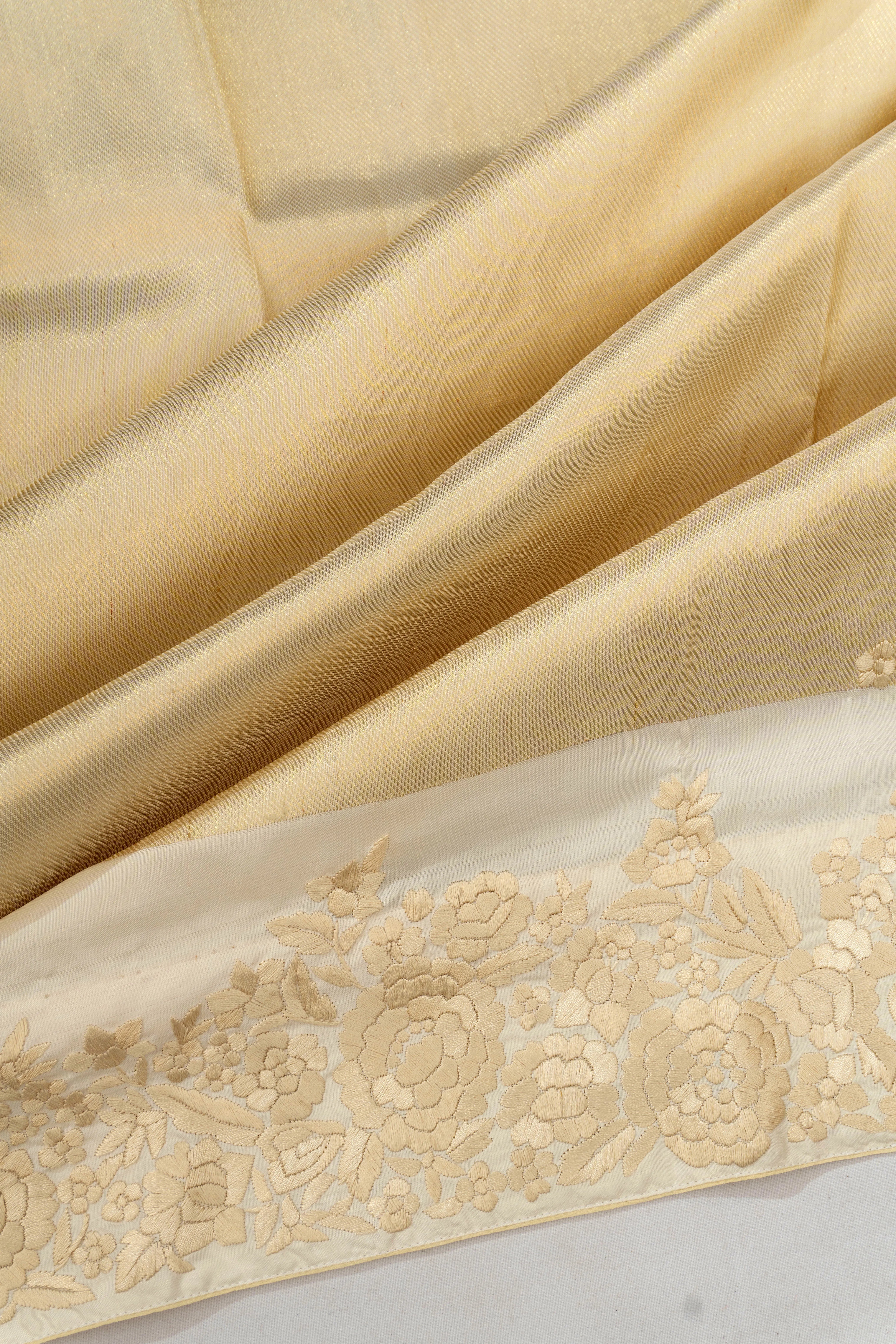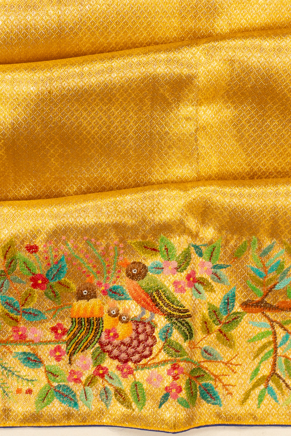 In order to identify Kanchi Tissue Pattu sarees, you first need to check the quality of the silk fabric and the zari used. To do so, many people use the burning technique but it is not an absolute test. You can also check to see if the loose zari threads are red in colour, as traditionally, the zari is mixed with silk strands and then dipped in gold. This ensures its purity. However, the simplest way to identify a pure golden tissue silk saree is to check for the government-approved silk mark.