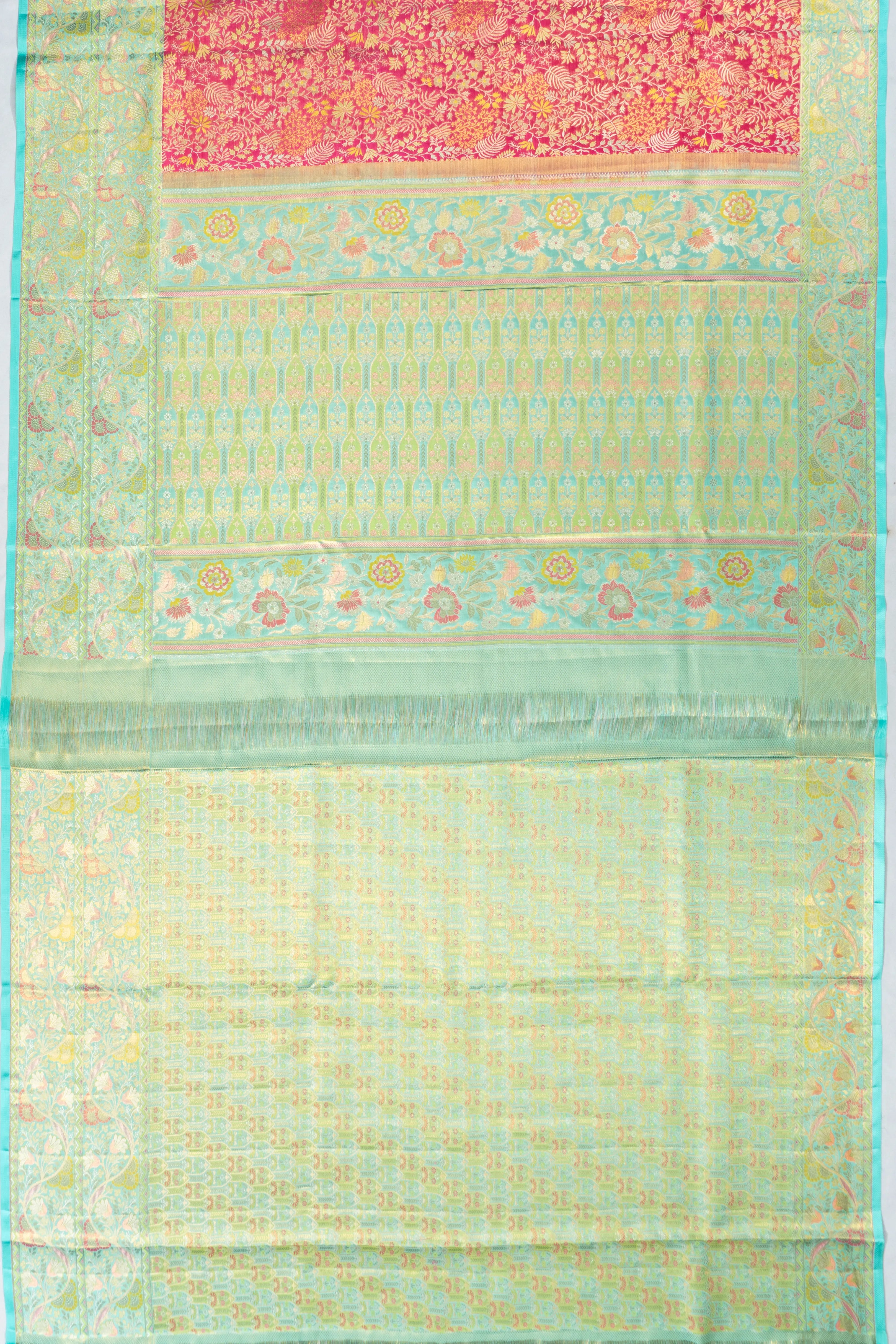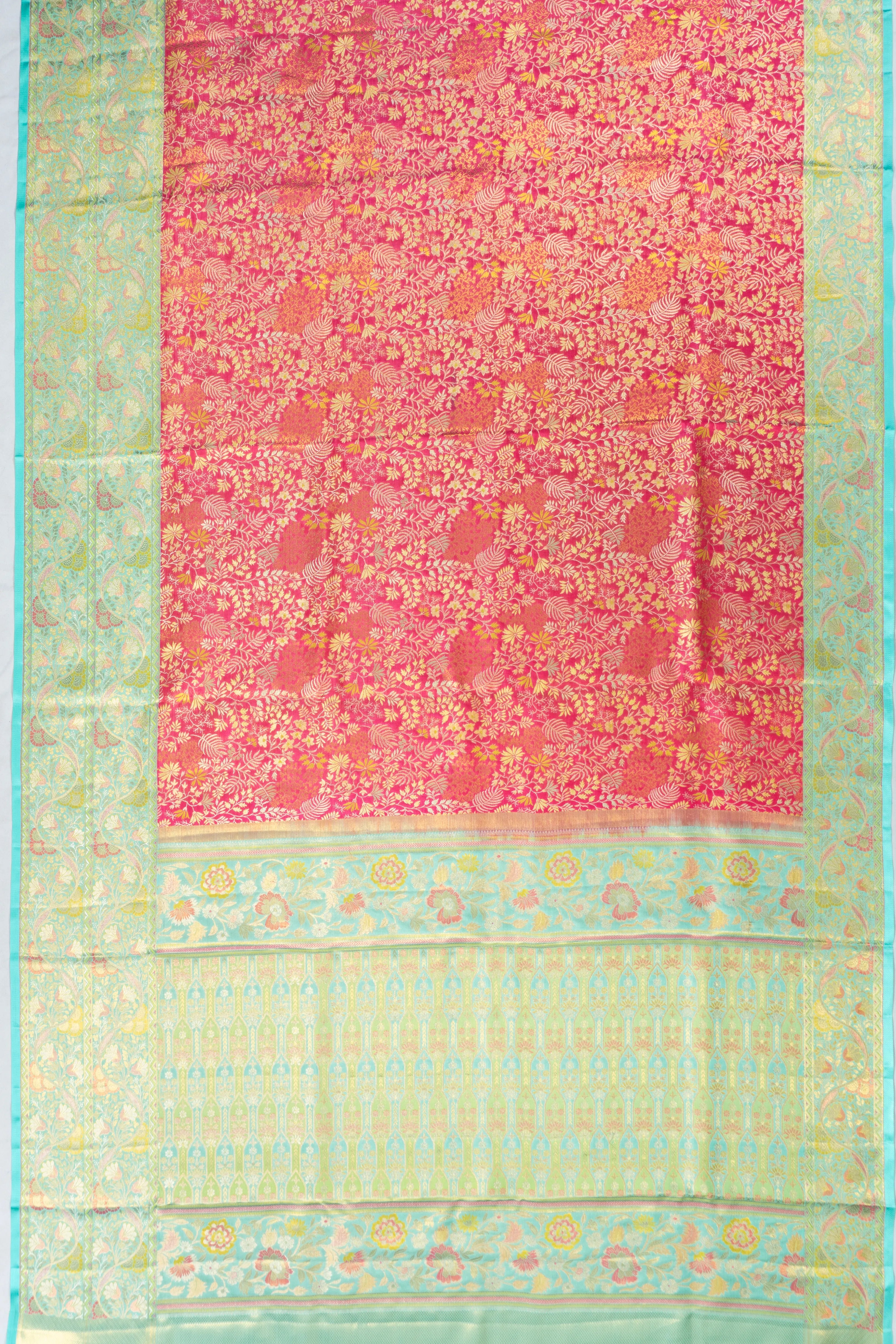 Adding a touch of contrast, the saree features a sky blue border and pallu, both beautifully woven with gold and silver zari floral brocade and delicate floral vines