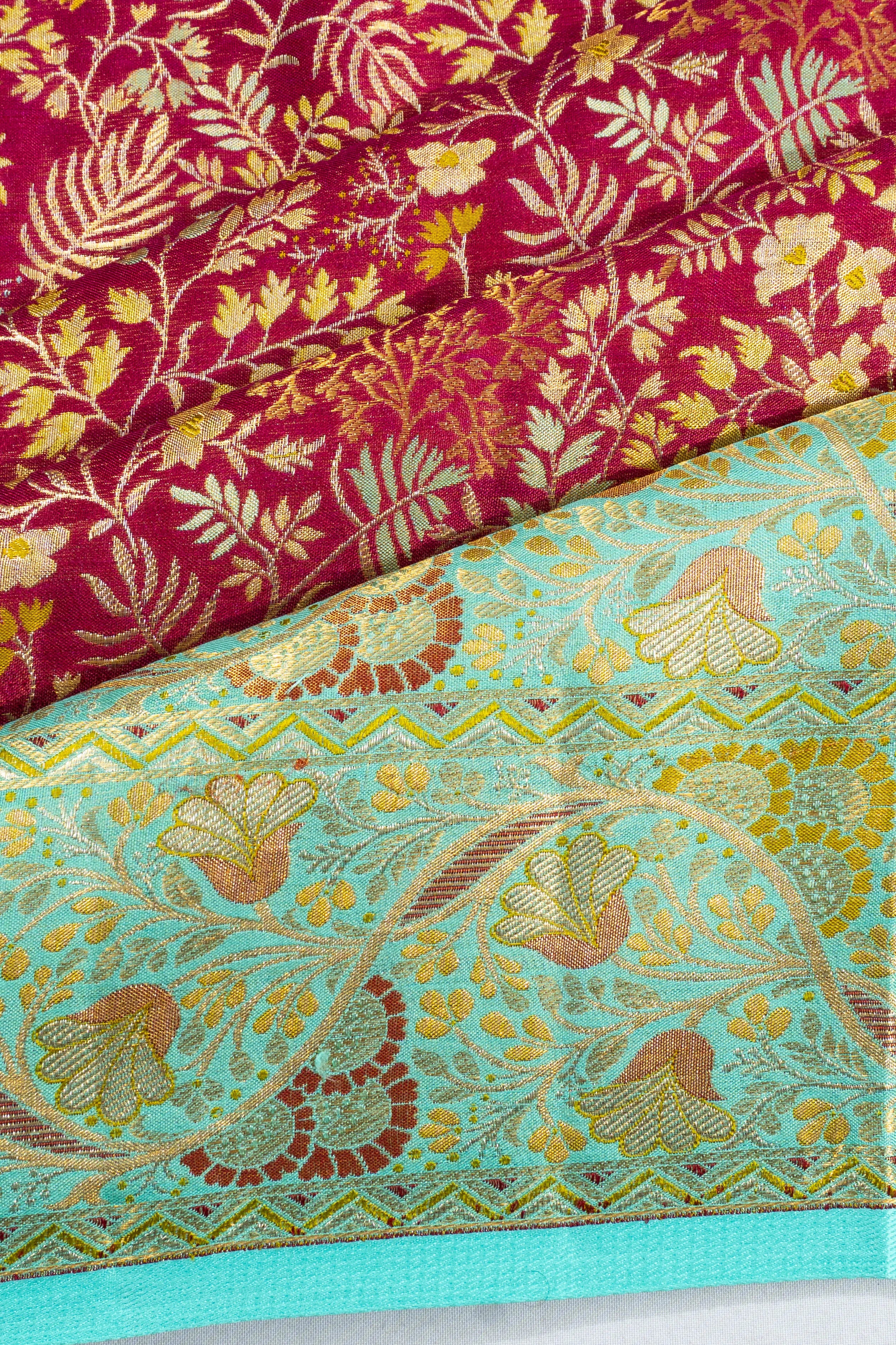 The saree's body is a stunning canvas of gold and silver zari floral brocade, exuding an ethereal glow that captivates the eye