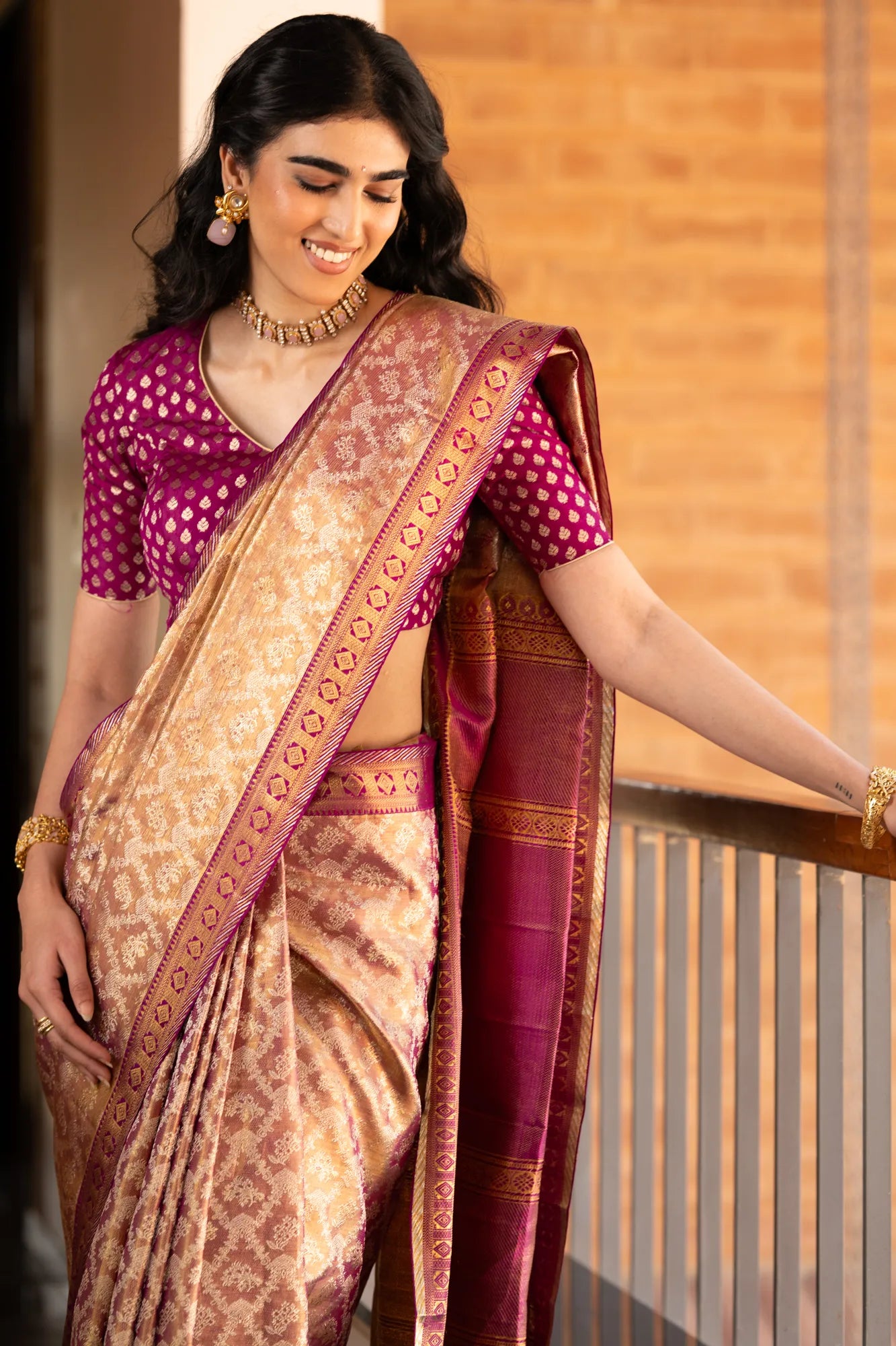 The body boasts a luxurious gold zari tissue floral brocade that captures the eye and reflects timeless beauty with every fold