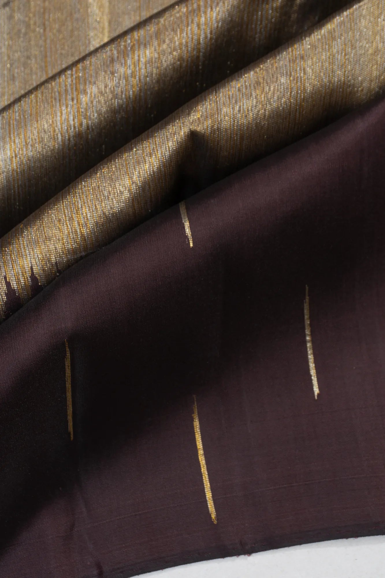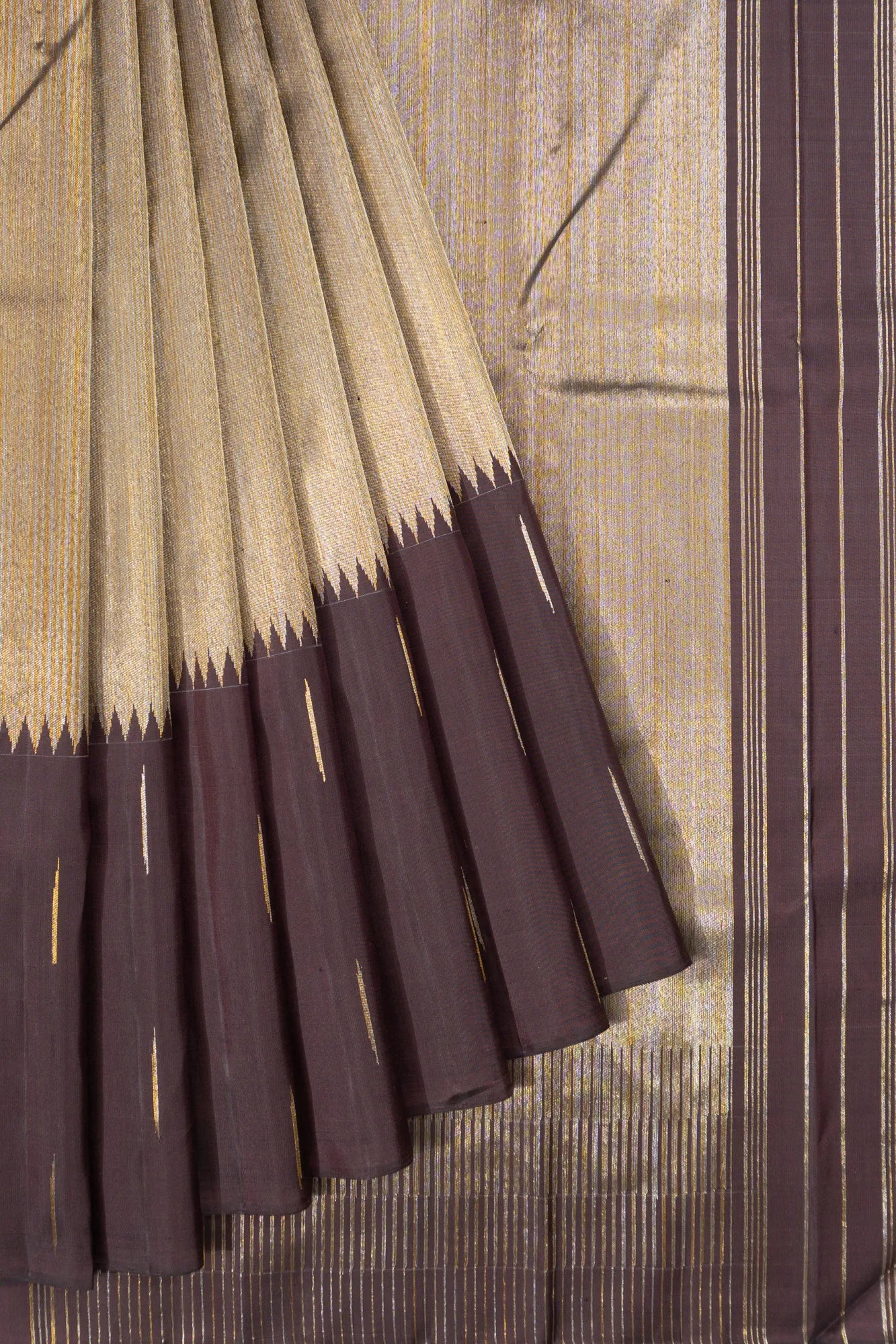 The body features gold zari tissue lines that exude a regal charm, while the striking contrast of the brown border, adorned with gold and silver zari line buttas, adds a touch of grandeur